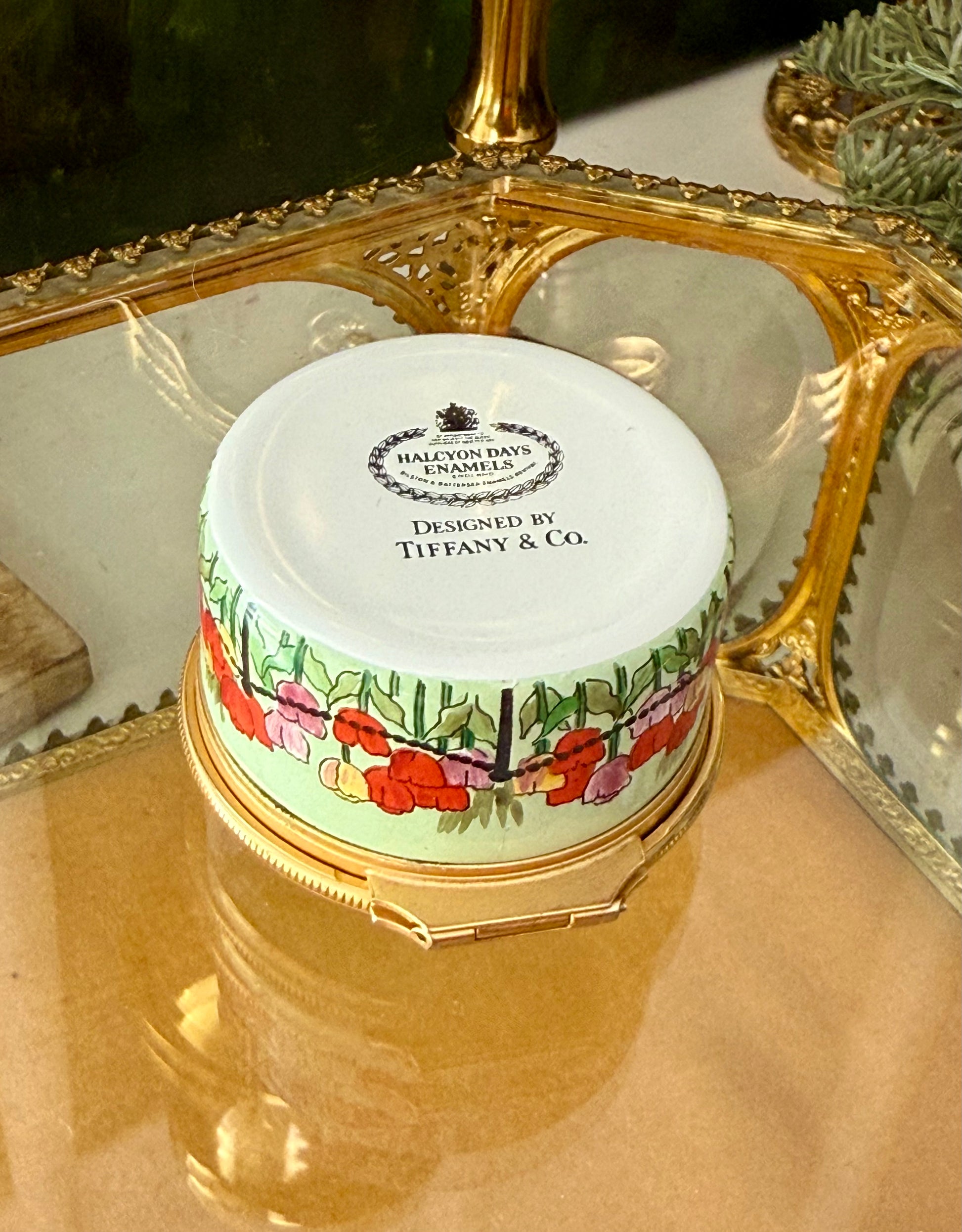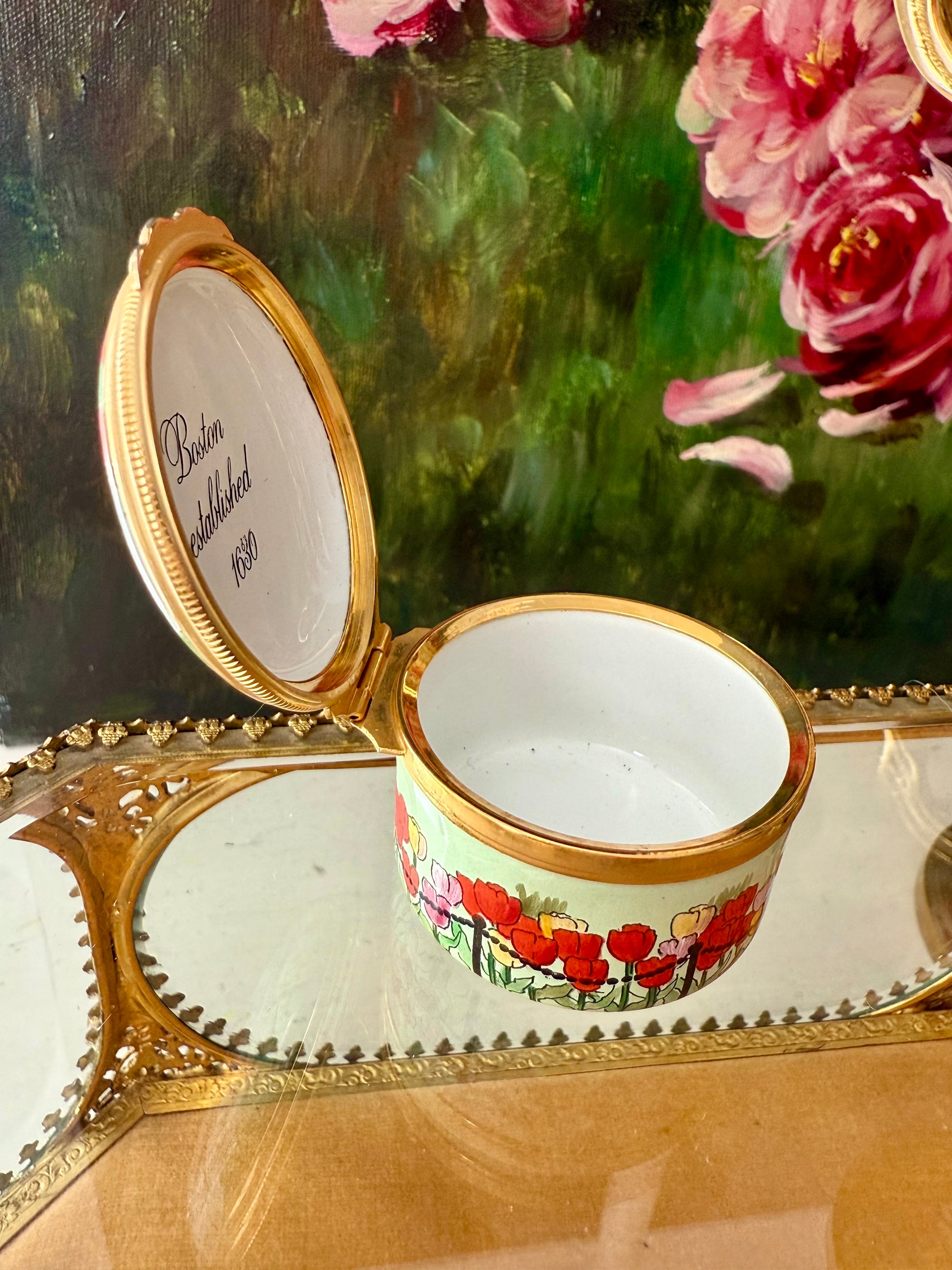 Beautiful hand-painted Halcyon Days Boston Swan Boats vintage enamel pill or jewelry box designed by Tiffany & Co. It’s in very good vintage condition. Made in England. The trinket box will be shipped without its original box. I'm selling it as is. Inside the lid of the box is this inscription: “Boston established 1630”