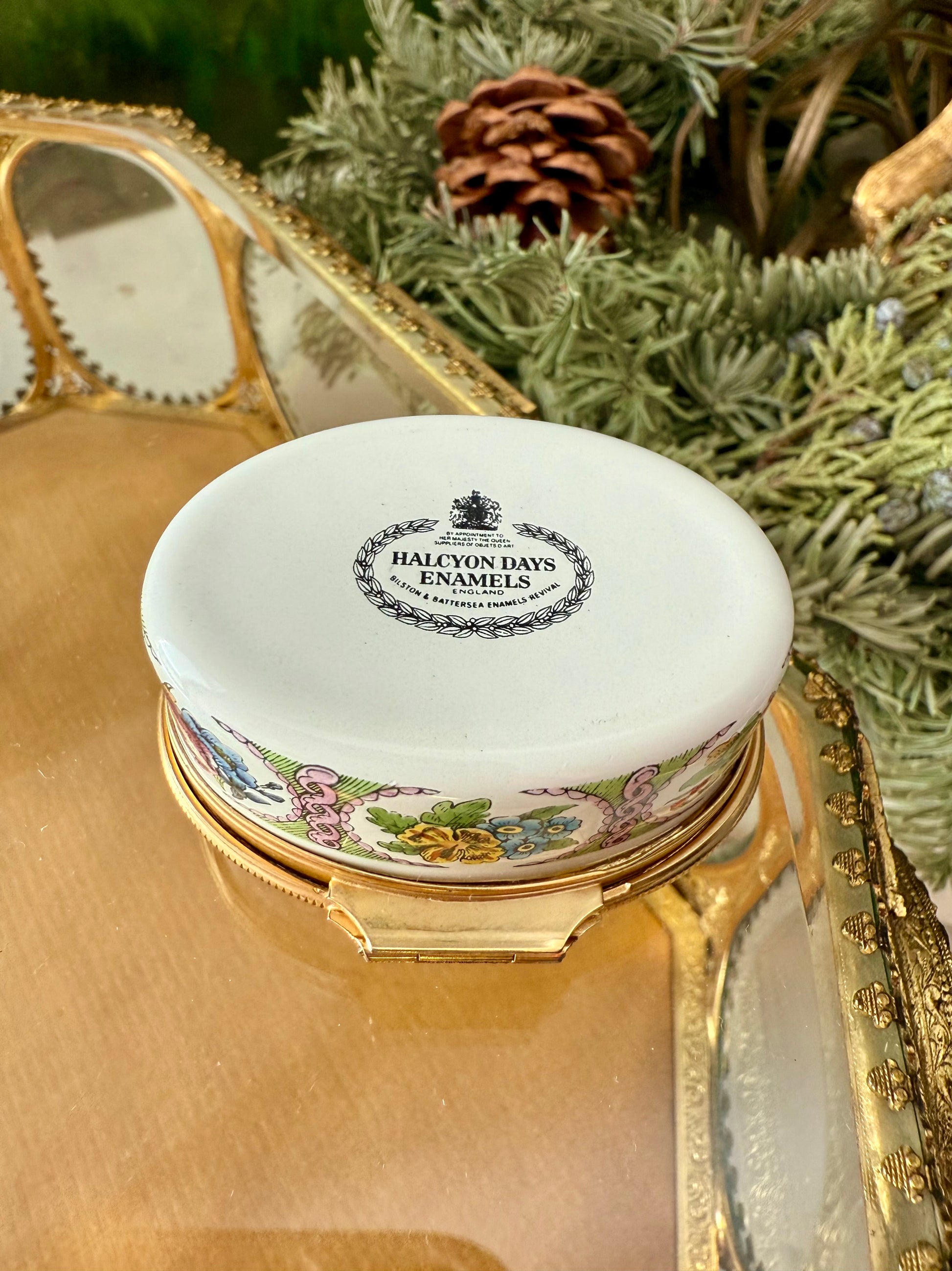 Beautiful Halcyon Days vintage enamel floral jewelry or trinket (pill) box. It’s in very good vintage condition. S.F. monogram visible on the top of the box. Halcyon Days enamel boxes are hand-painted in the UK, and individual artists often sign their work with their monogram or unique mark, typically on the bottom or lid. The product may have slight, almost imperceptible paint wear due to its age. Made in England.
