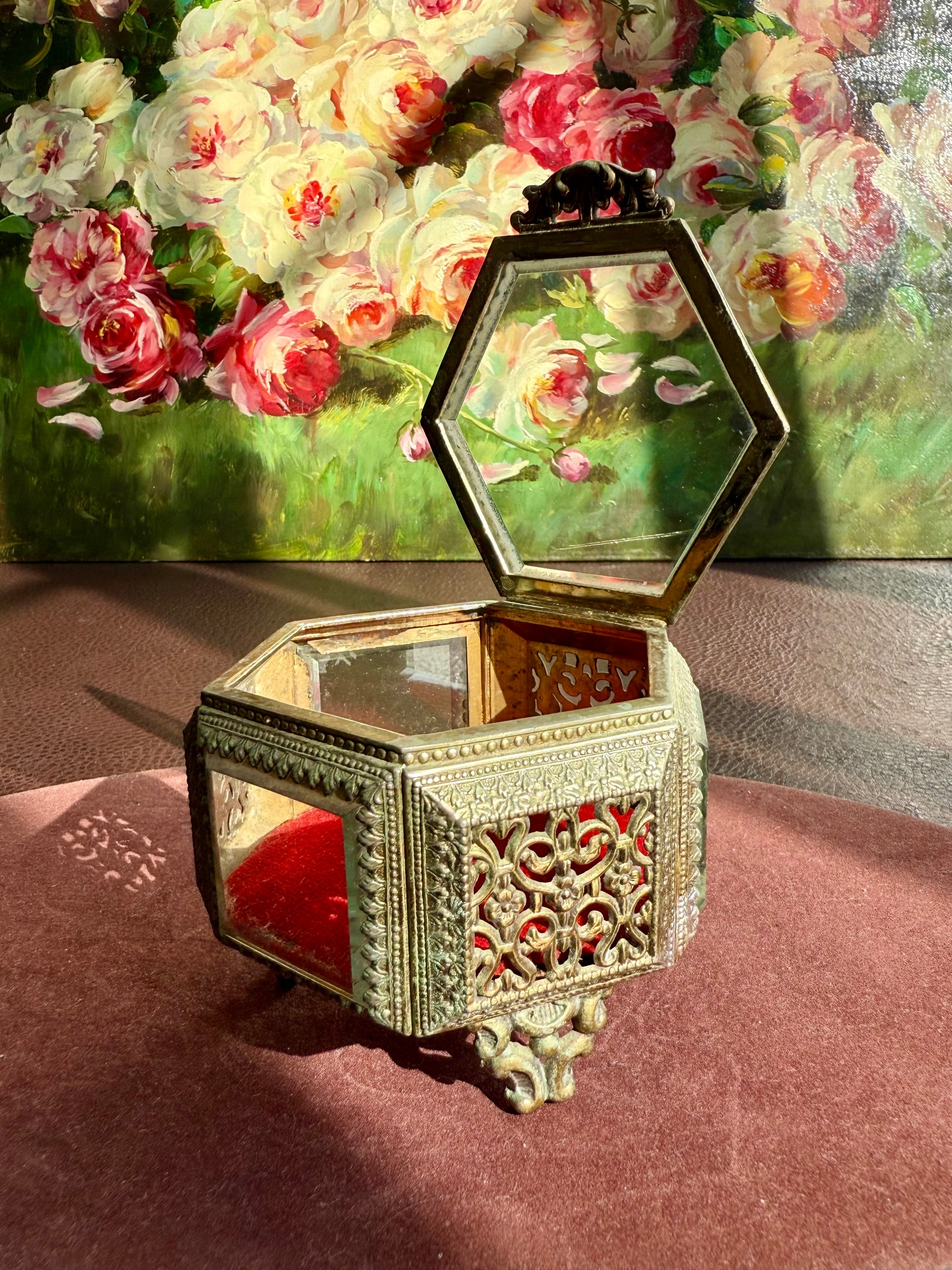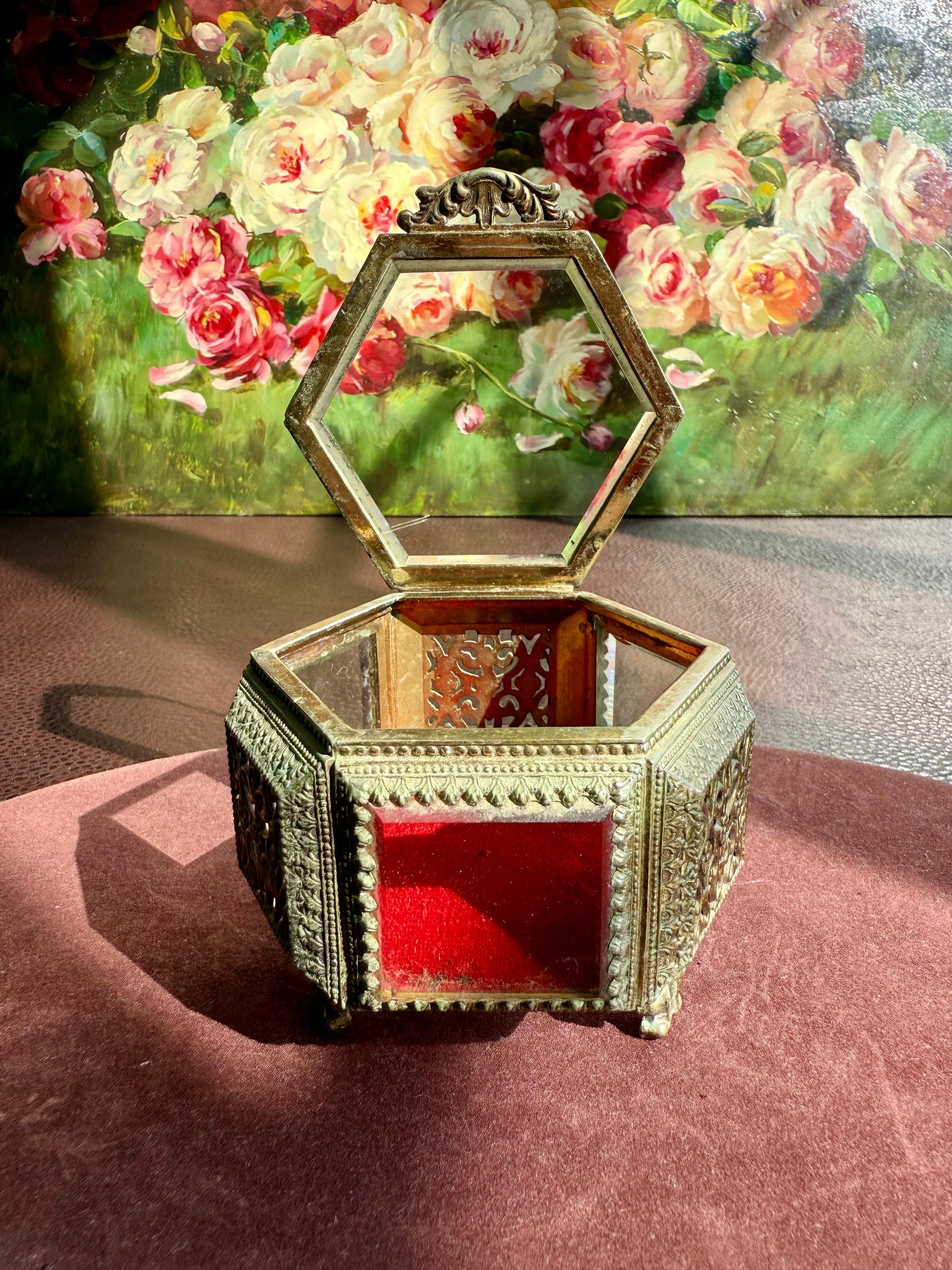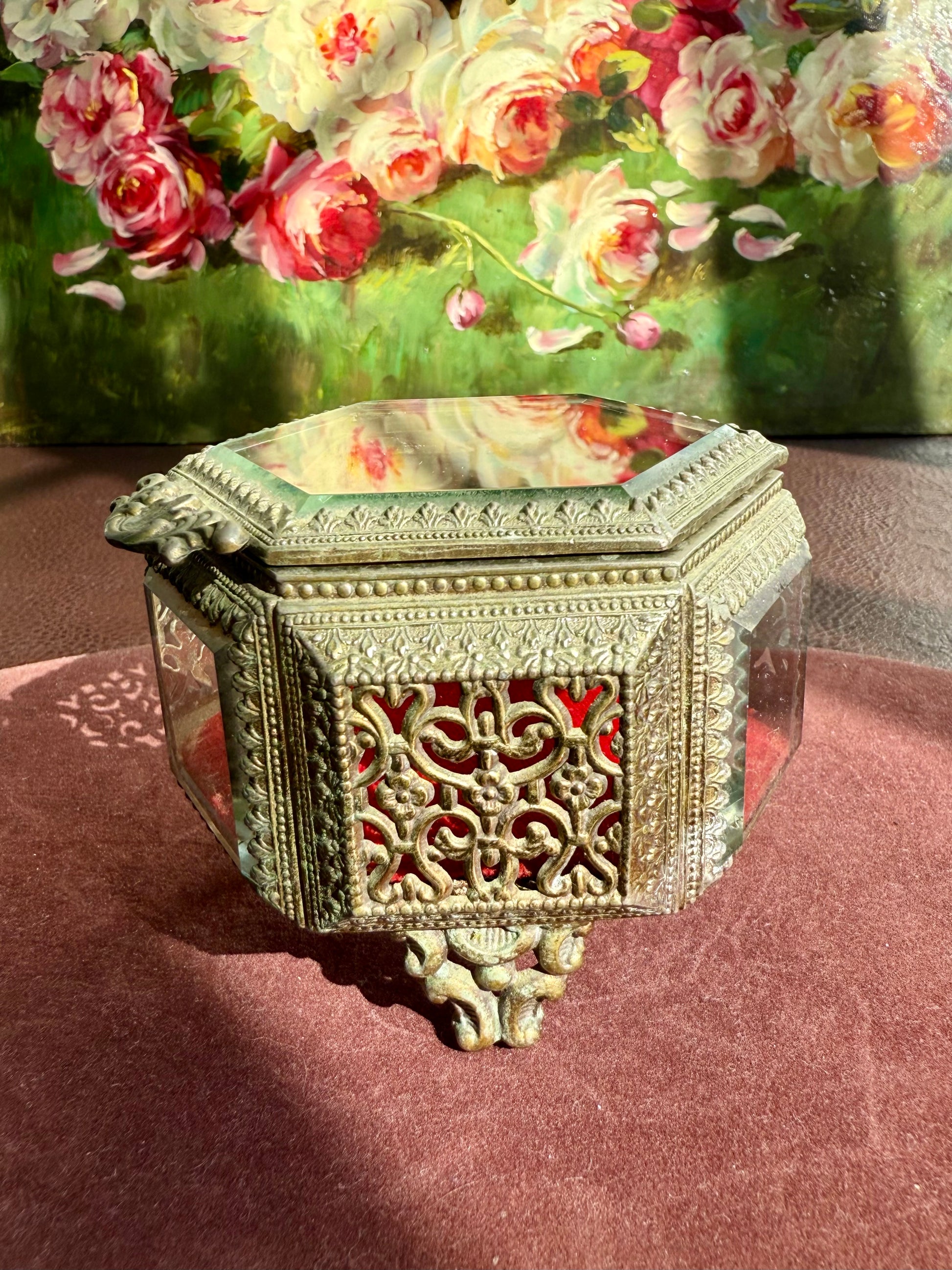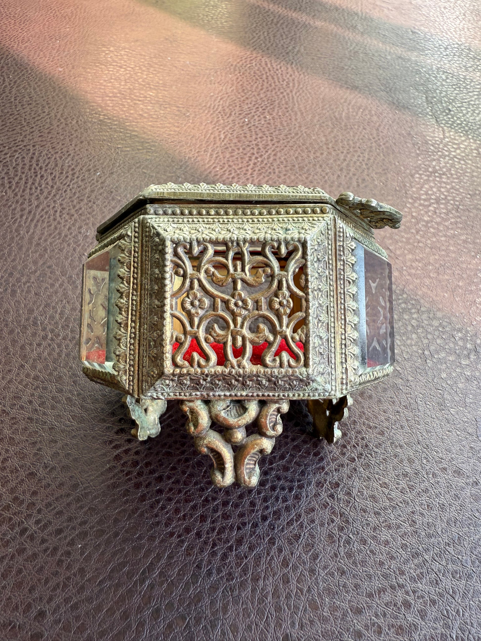 Beautiful small hexagonal jewelry casket (box) with red velvet interior. This gold-tone filigree trinket box features glasses on three sides and a top, separated by intricately detailed brass segments. The glass and metal are thick and good quality. It has three legs that is stands on. The trinket box is in very good vintage condition. Due to its age, there is minimal wear on the metal and red velvet parts.
