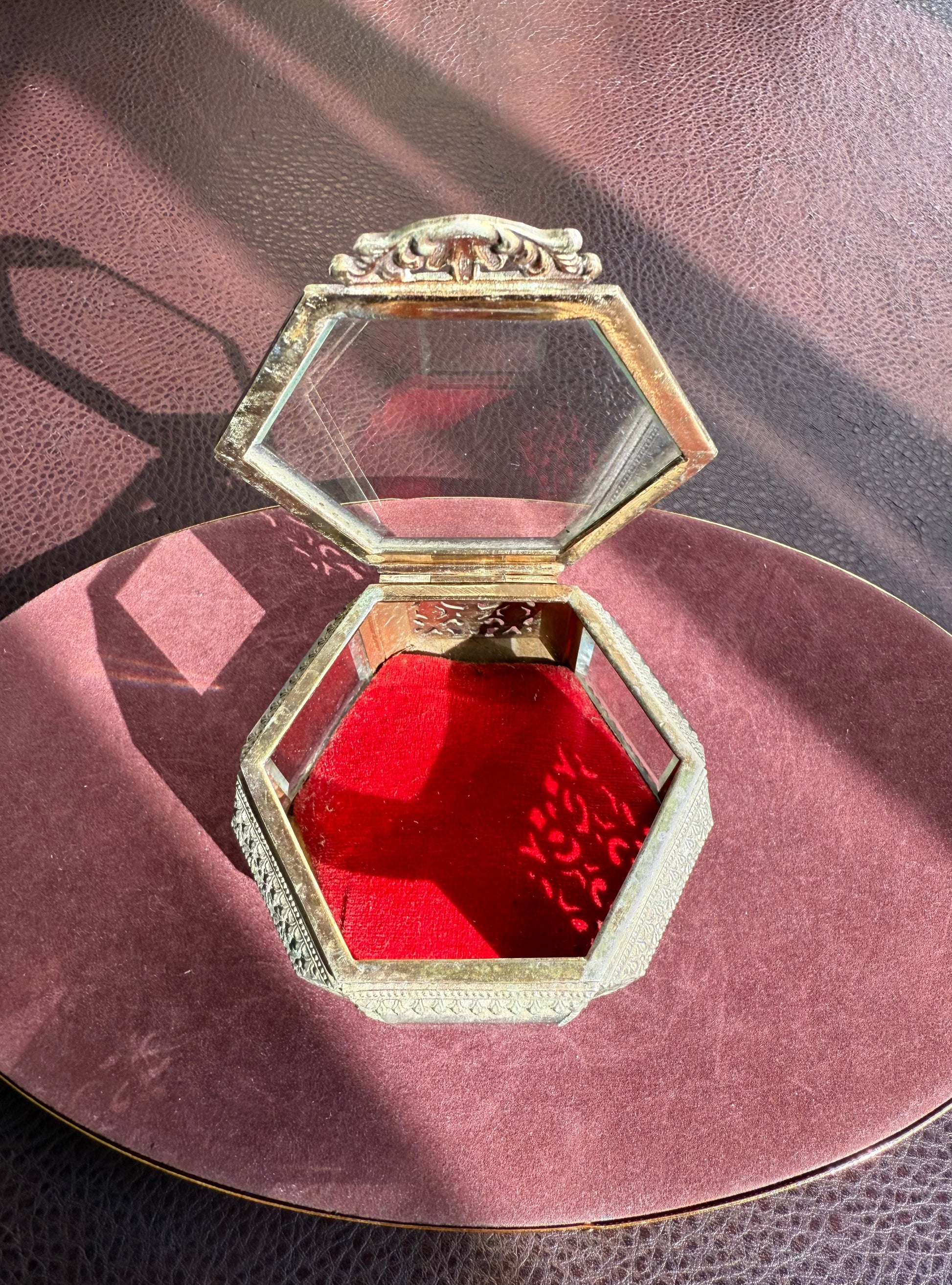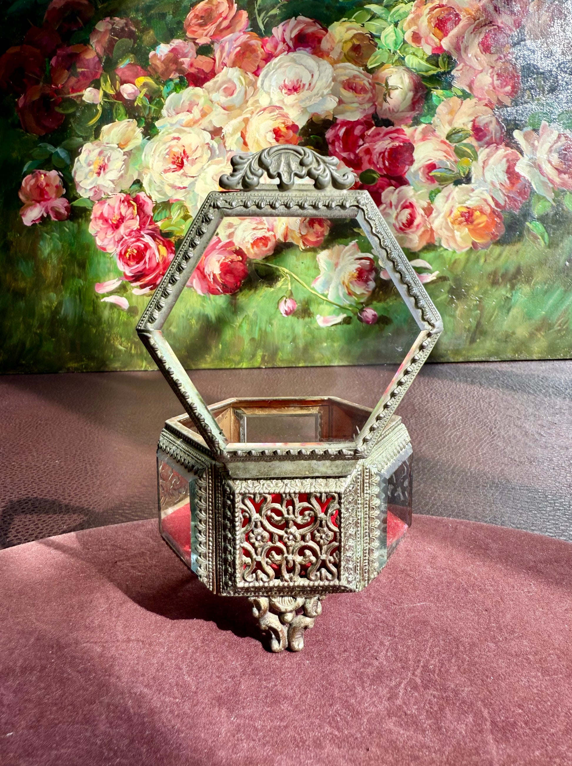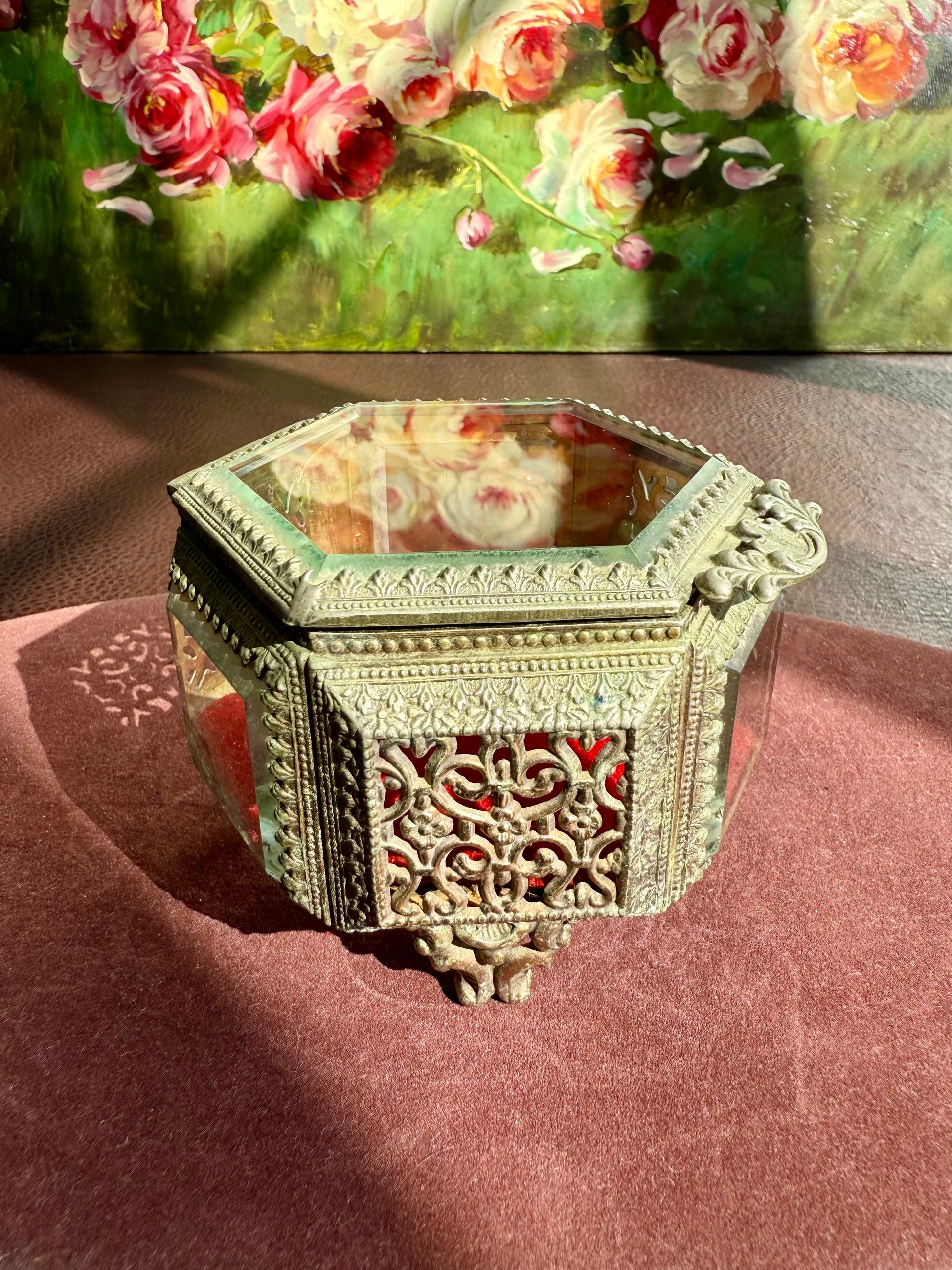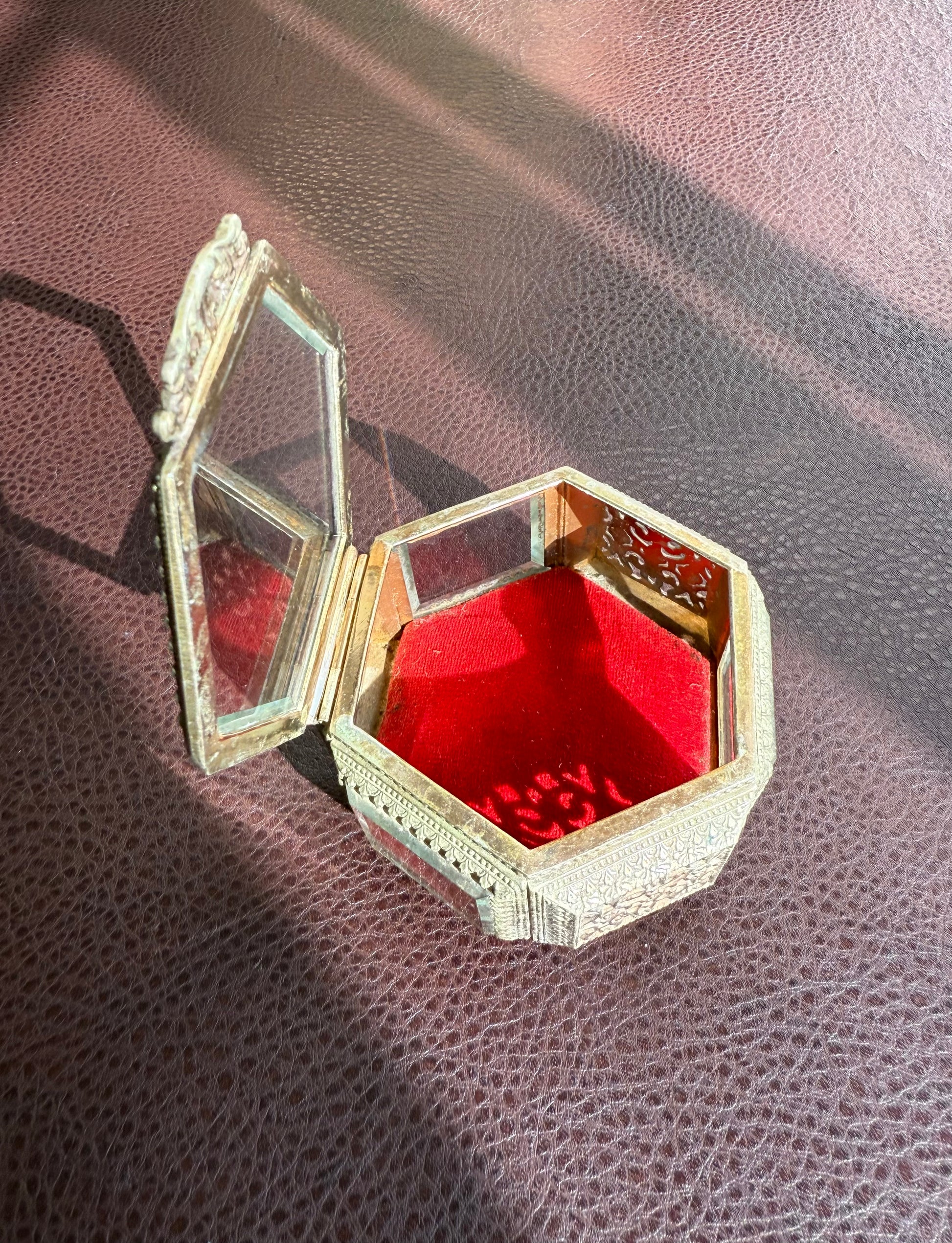 Beautiful small hexagonal jewelry casket (box) with red velvet interior. This gold-tone filigree trinket box features glasses on three sides and a top, separated by intricately detailed brass segments. The glass and metal are thick and good quality. It has three legs that is stands on. The trinket box is in very good vintage condition. Due to its age, there is minimal wear on the metal and red velvet parts.