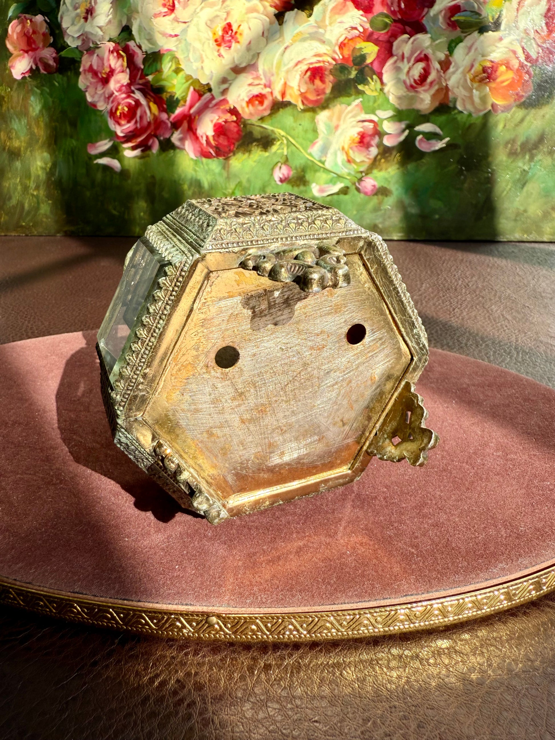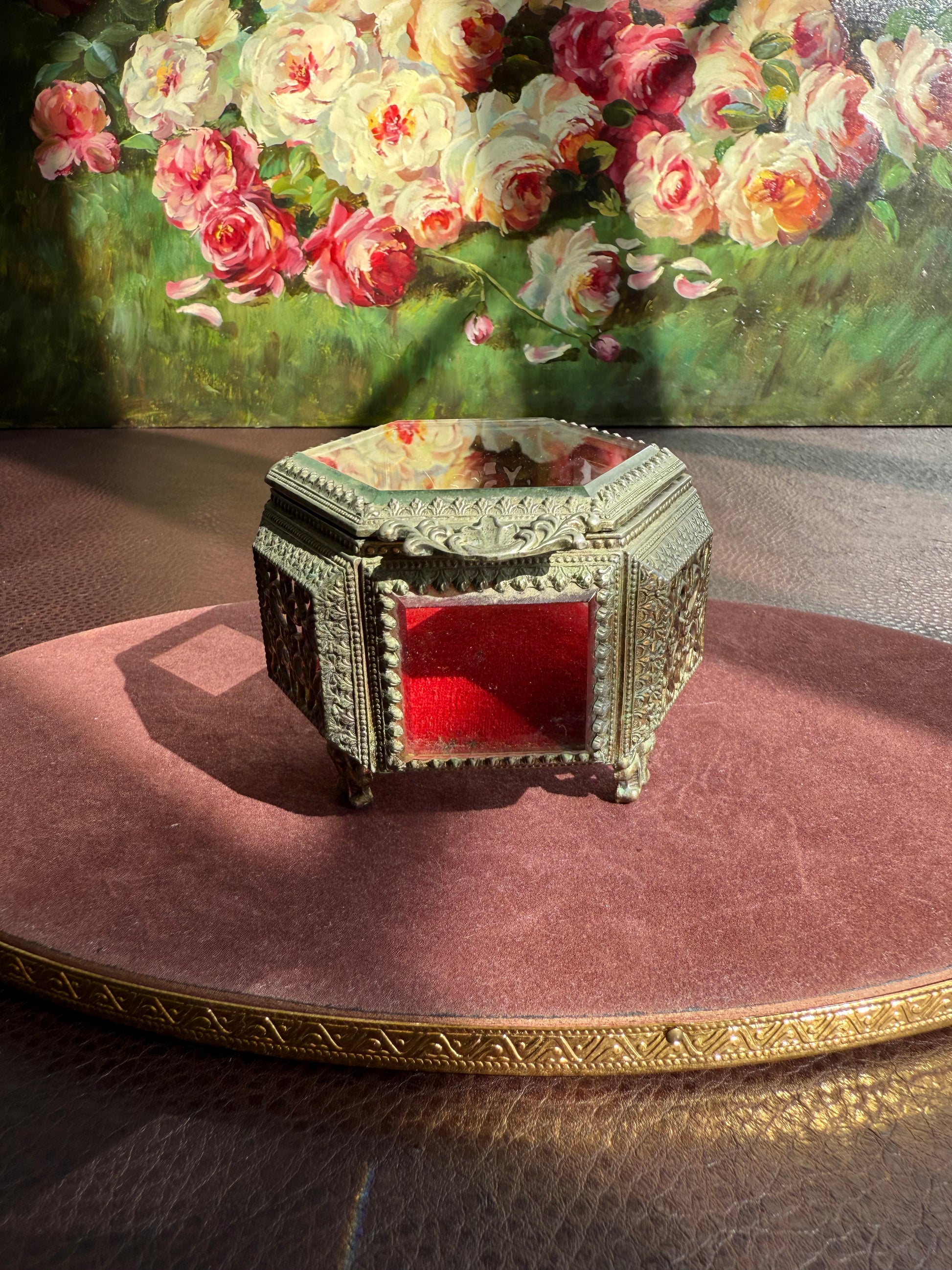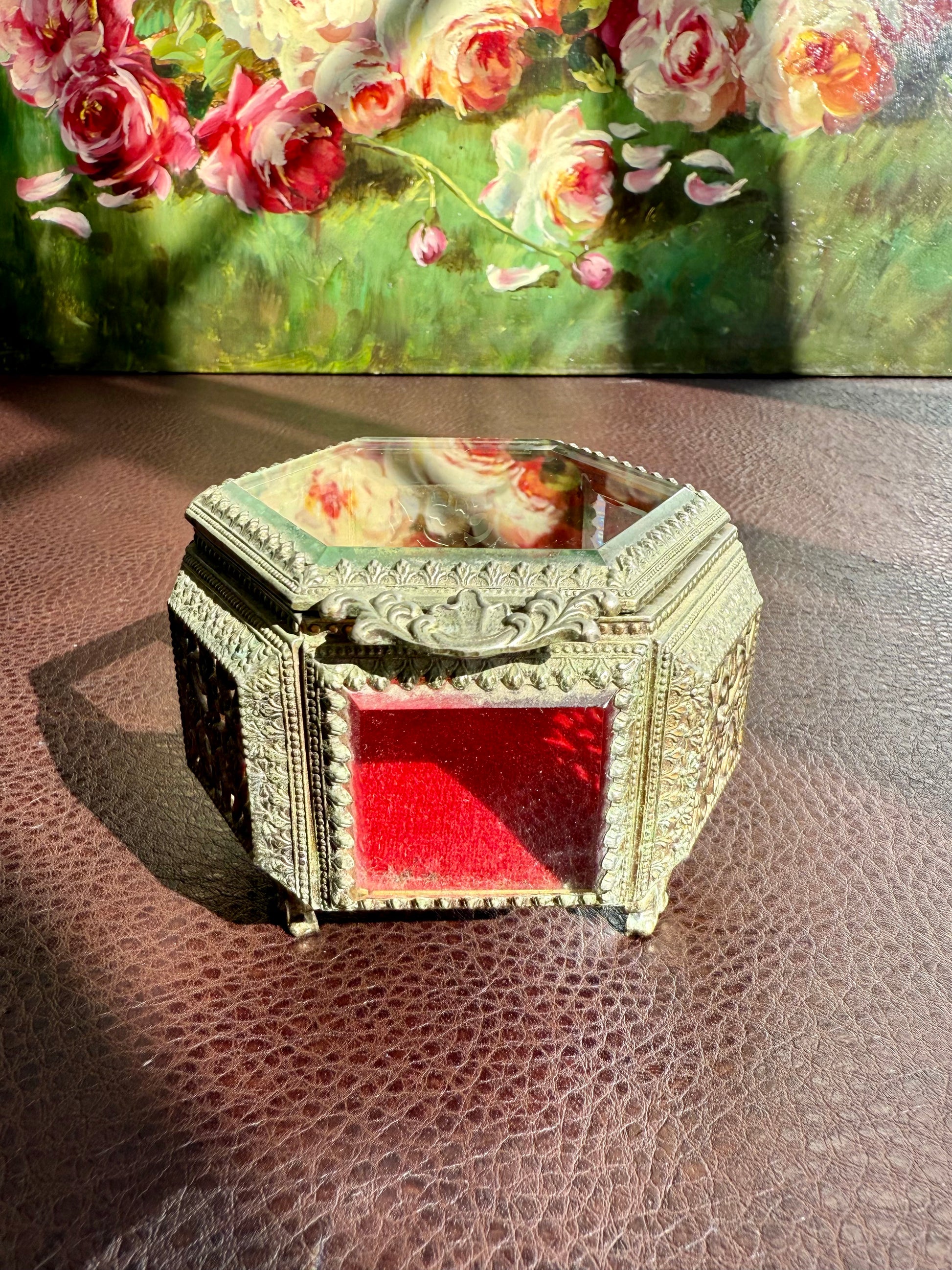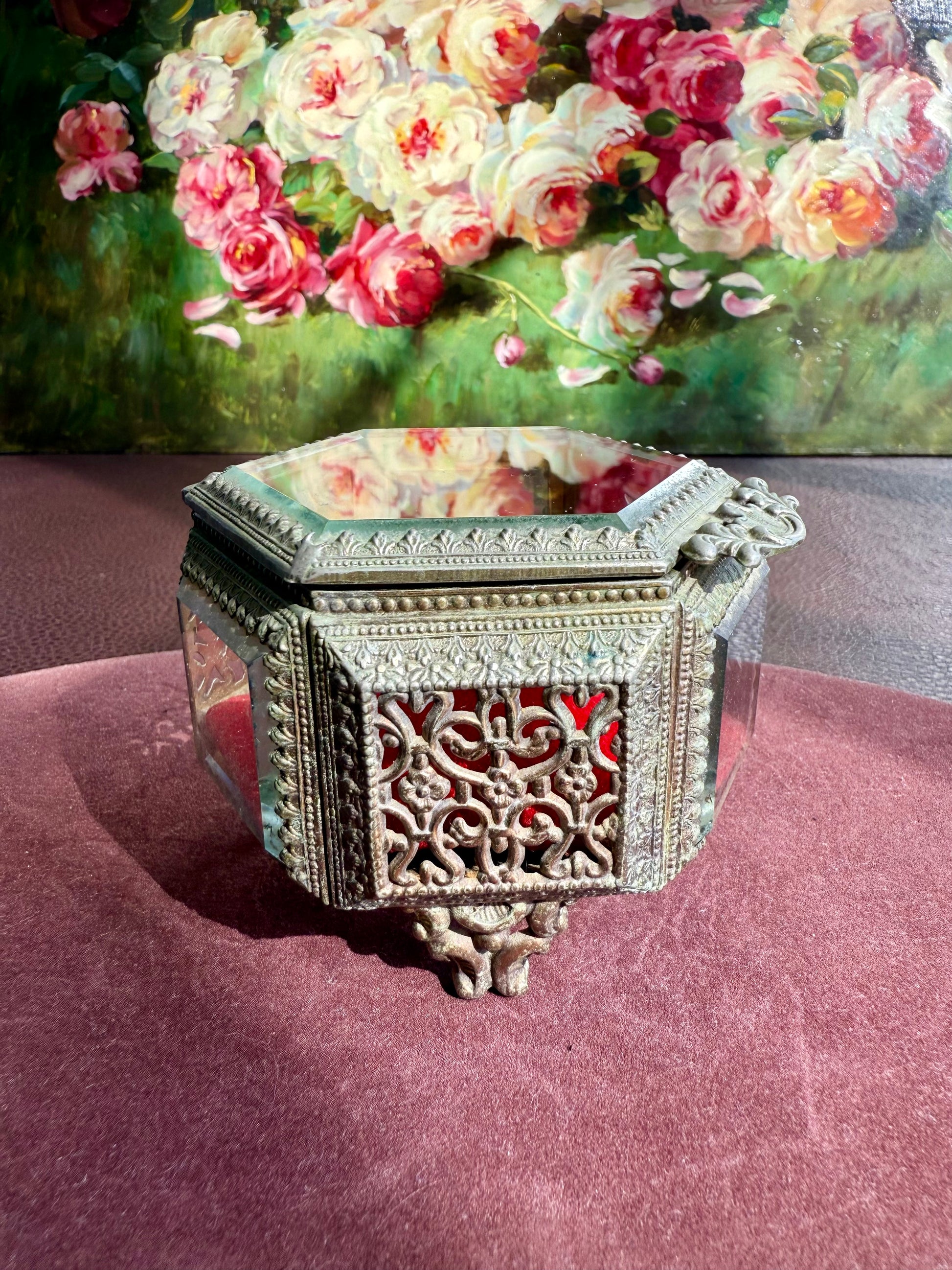 Beautiful small hexagonal jewelry casket (box) with red velvet interior. This gold-tone filigree trinket box features glasses on three sides and a top, separated by intricately detailed brass segments. The glass and metal are thick and good quality. It has three legs that is stands on. The trinket box is in very good vintage condition. Due to its age, there is minimal wear on the metal and red velvet parts.