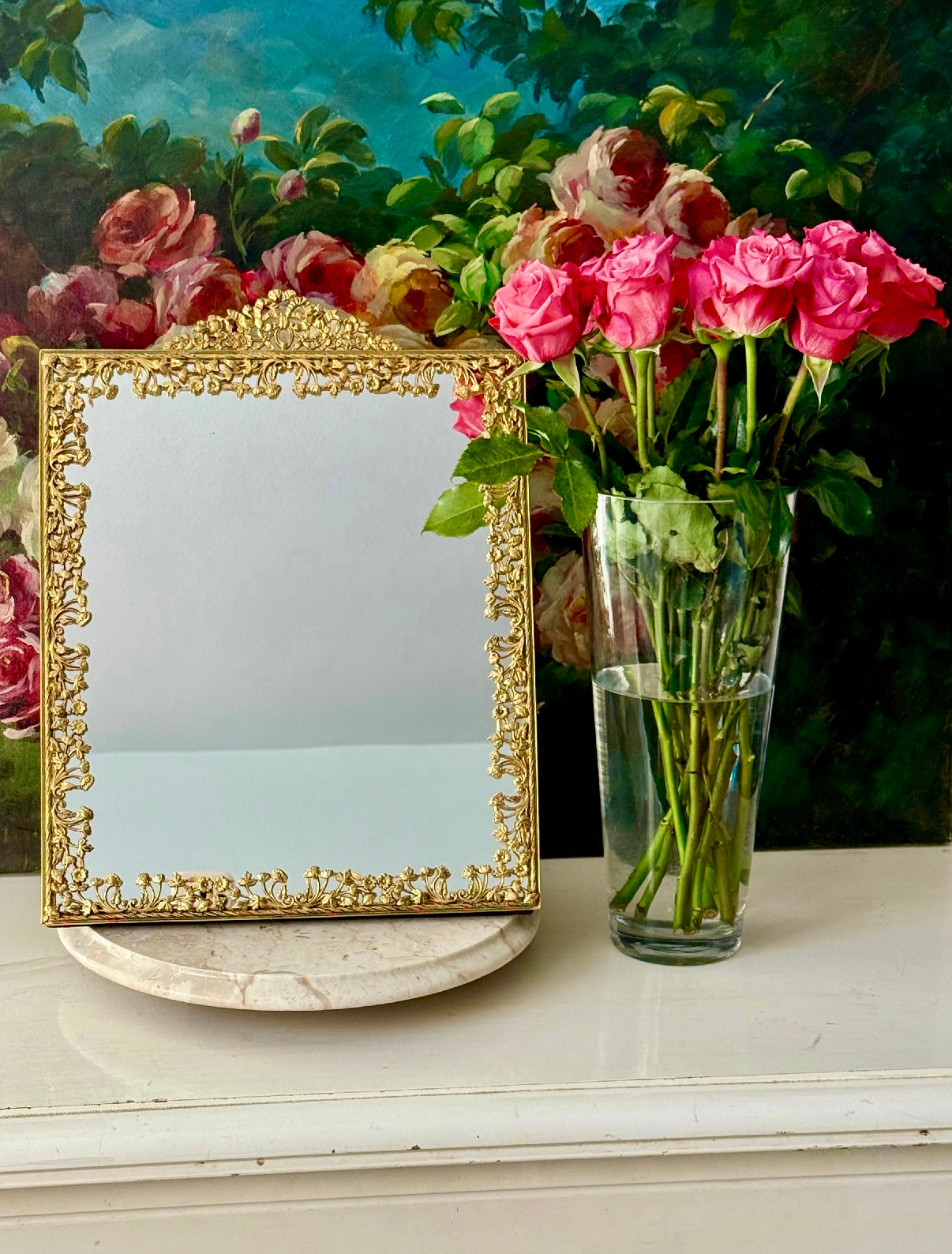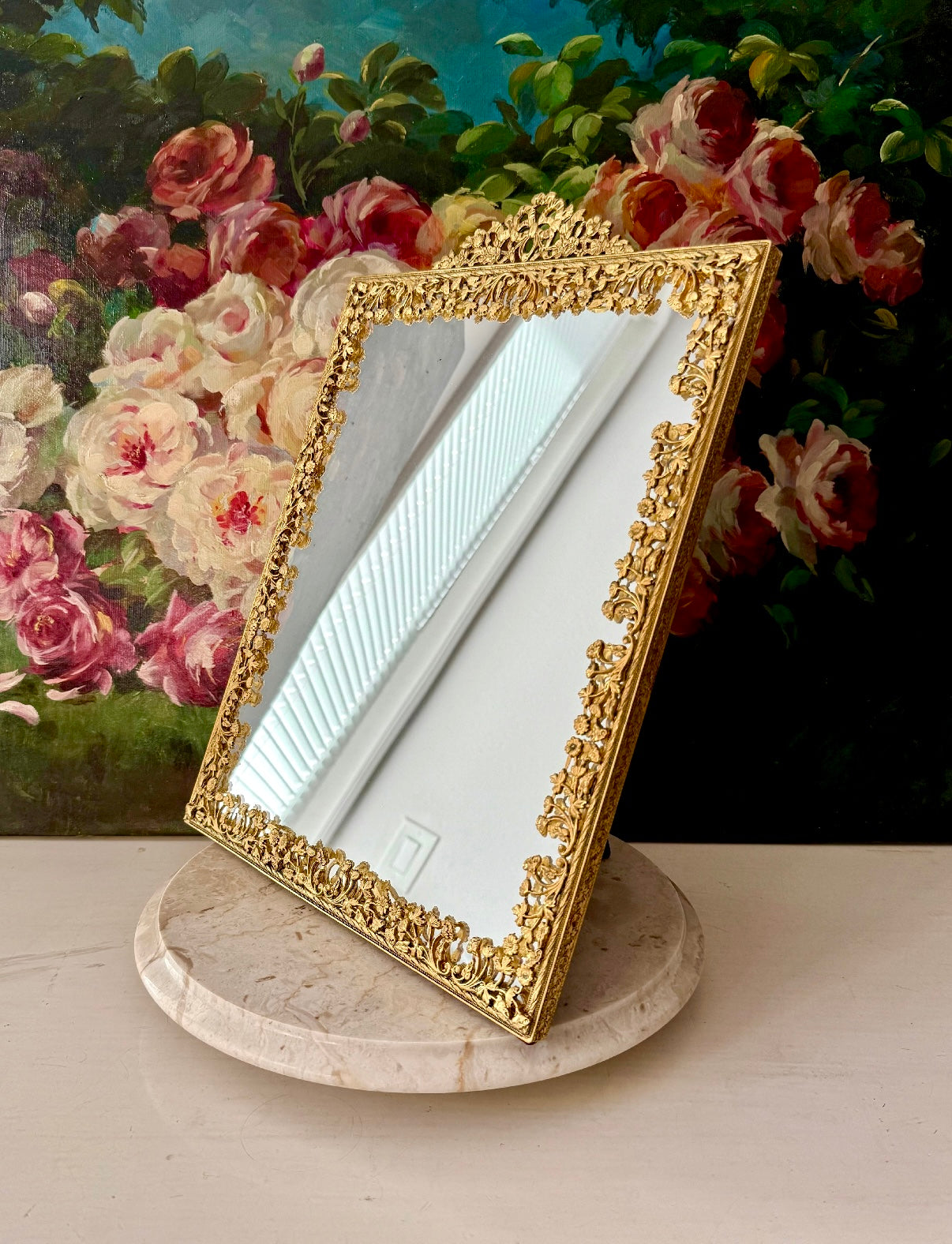 Antique/ Vintage French Victorian Style Gold-gilded Brass Framed Wall or Table Mirror with Flowers Decoration on the Frame