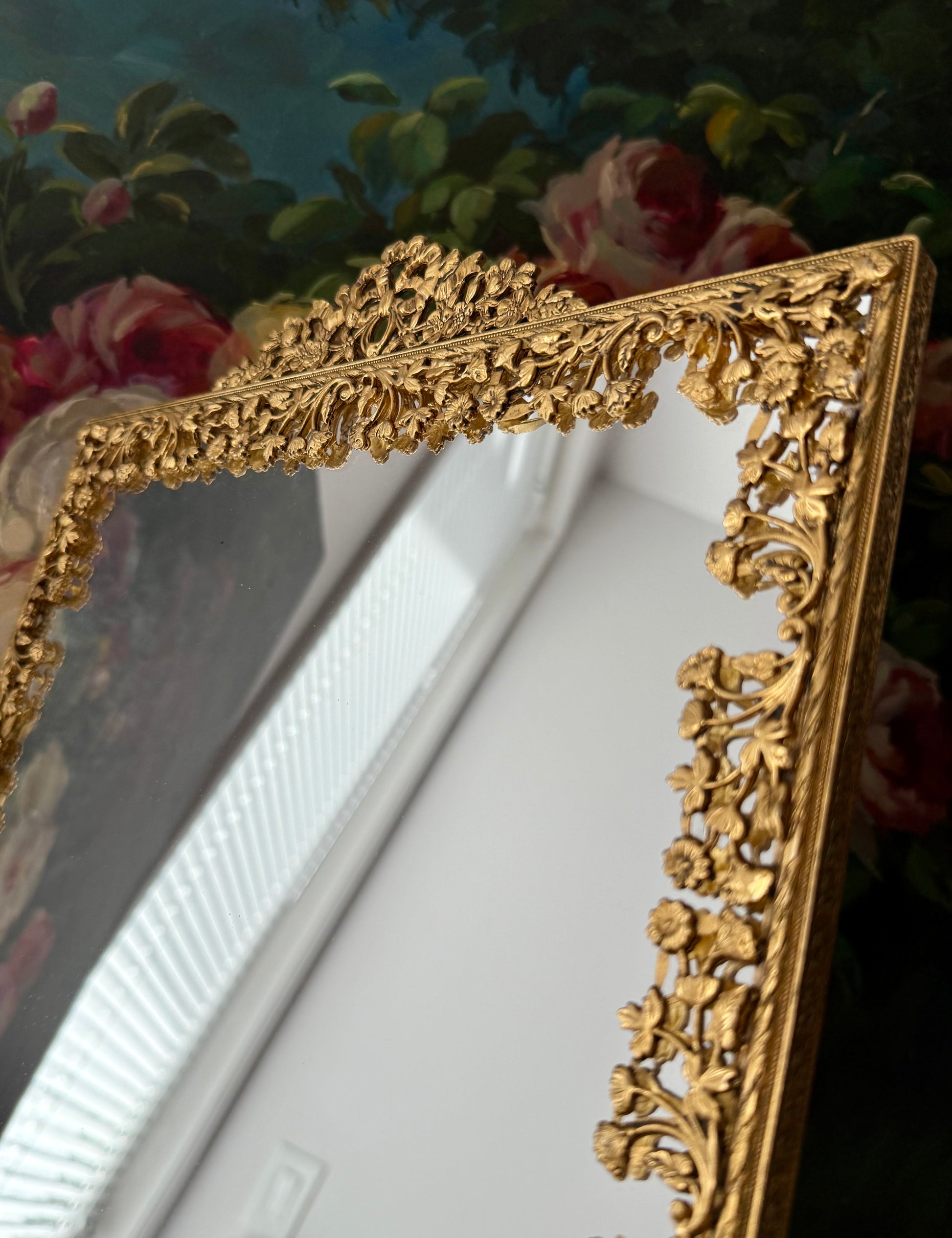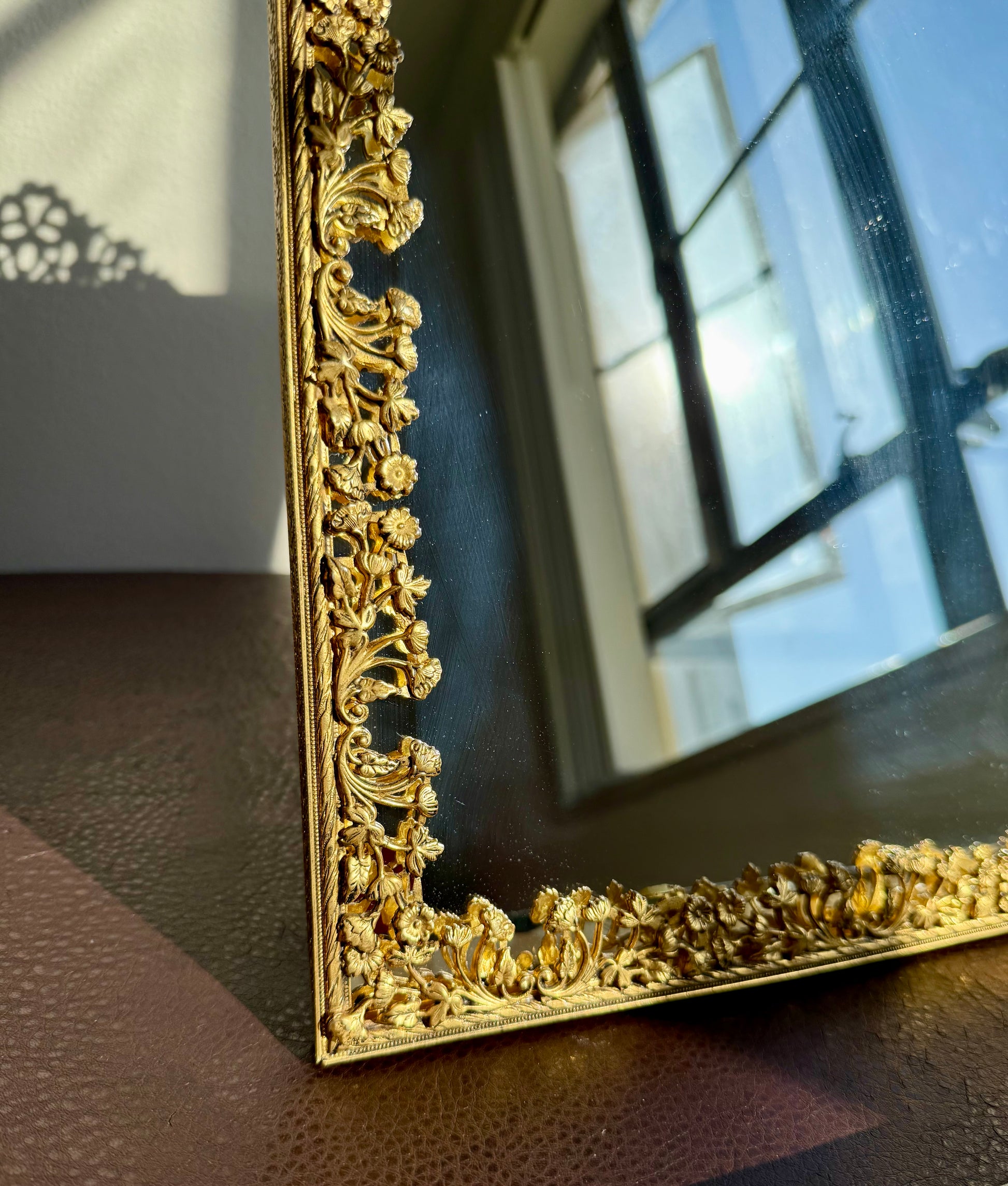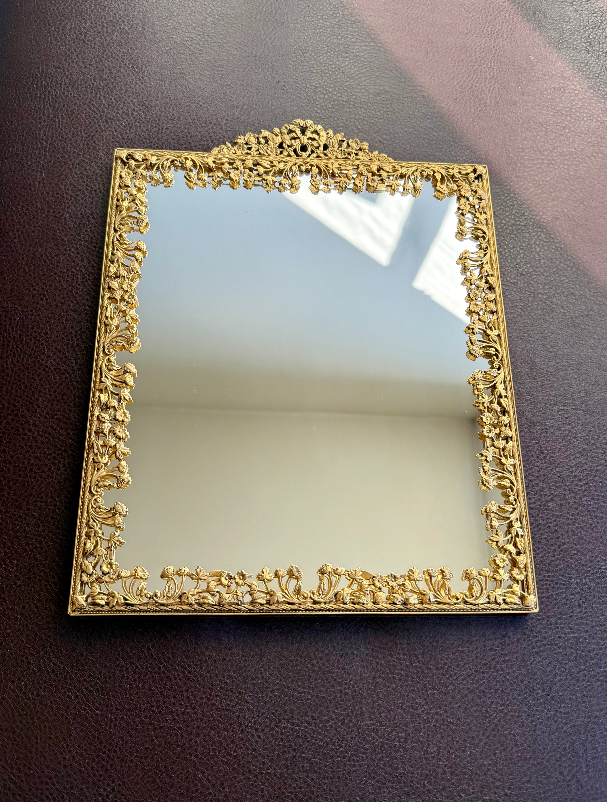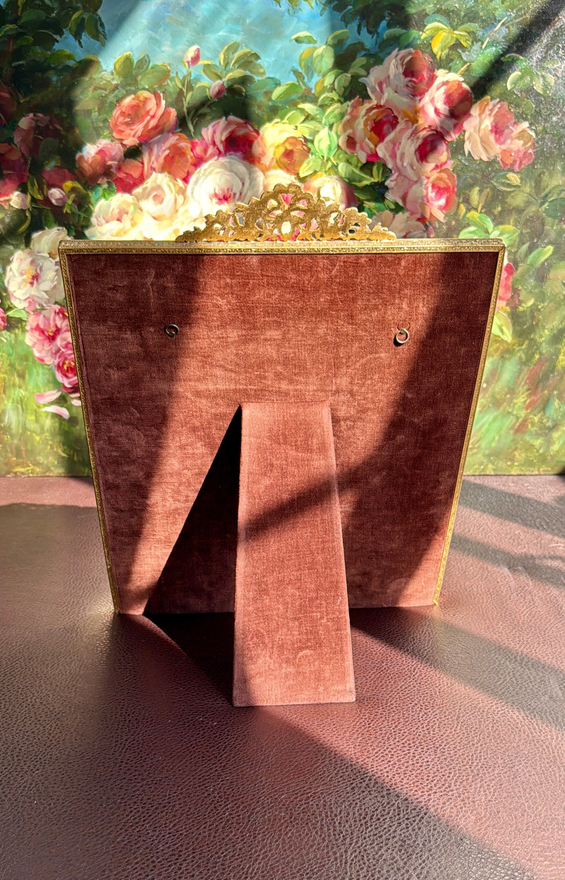 Beautiful French Victorian style, gilded brass framed vintage wall or table mirror with floral decoration on the frame. It’s in excellent vintage condition. The back of the picture frame is covered with brownish velvet material.