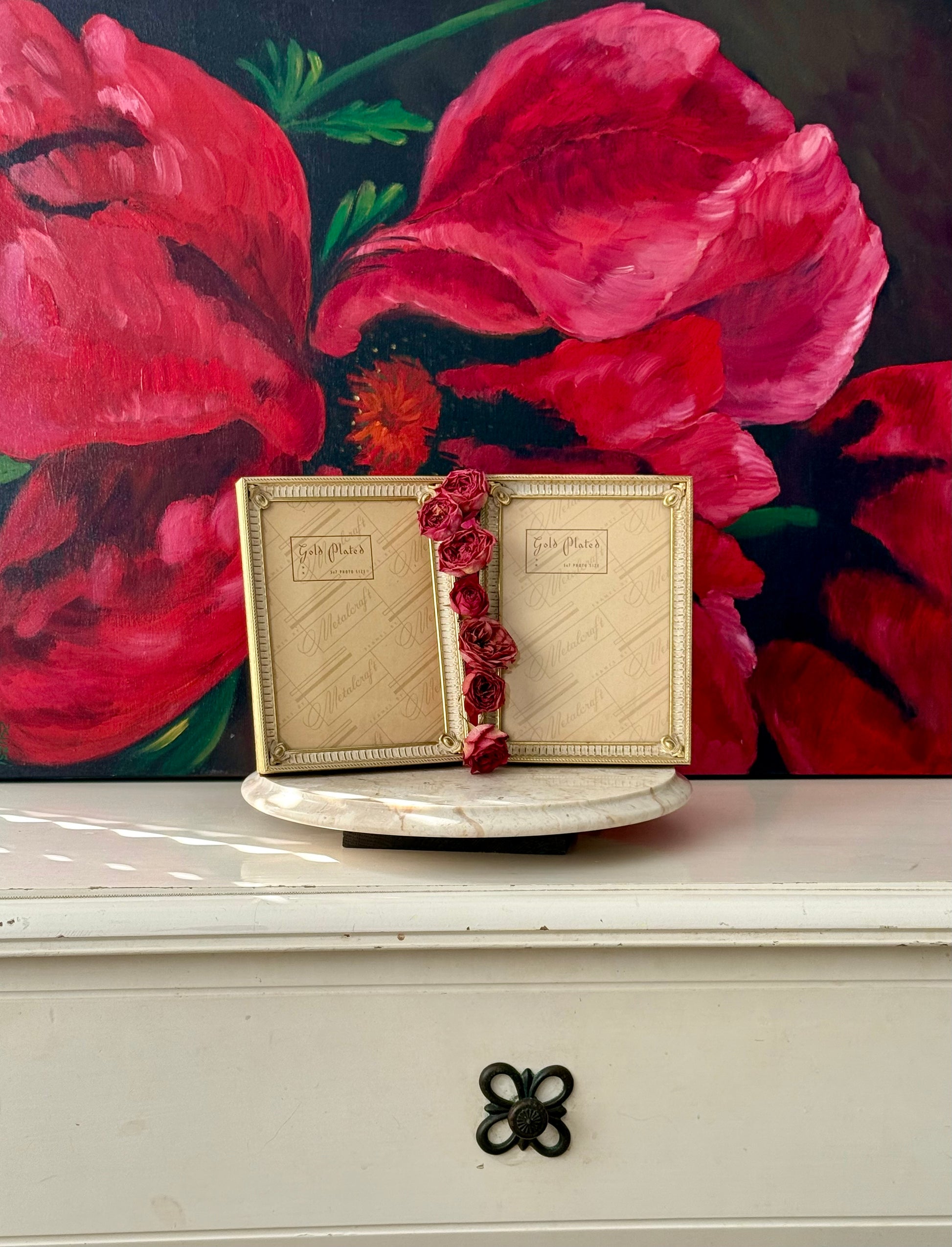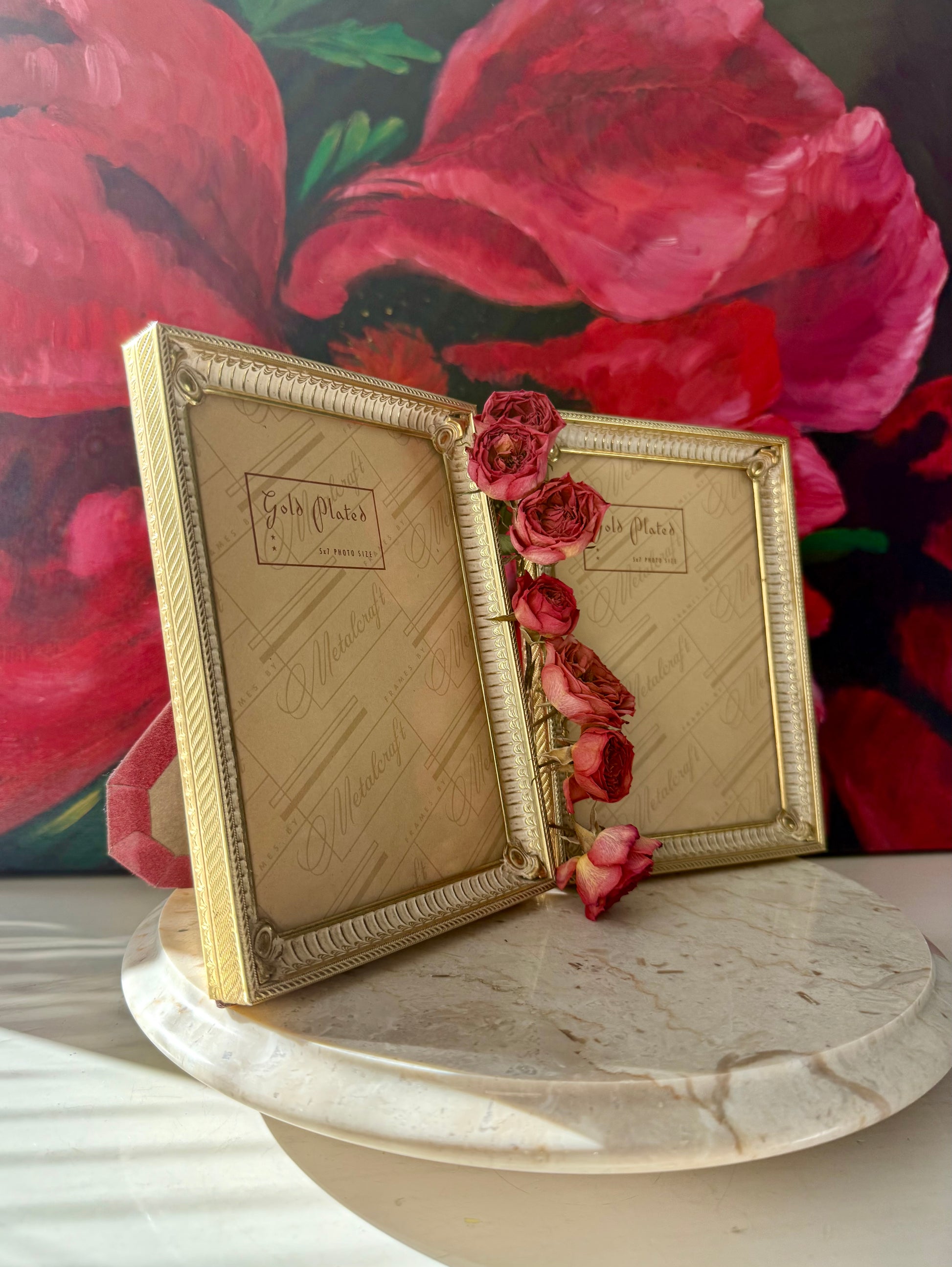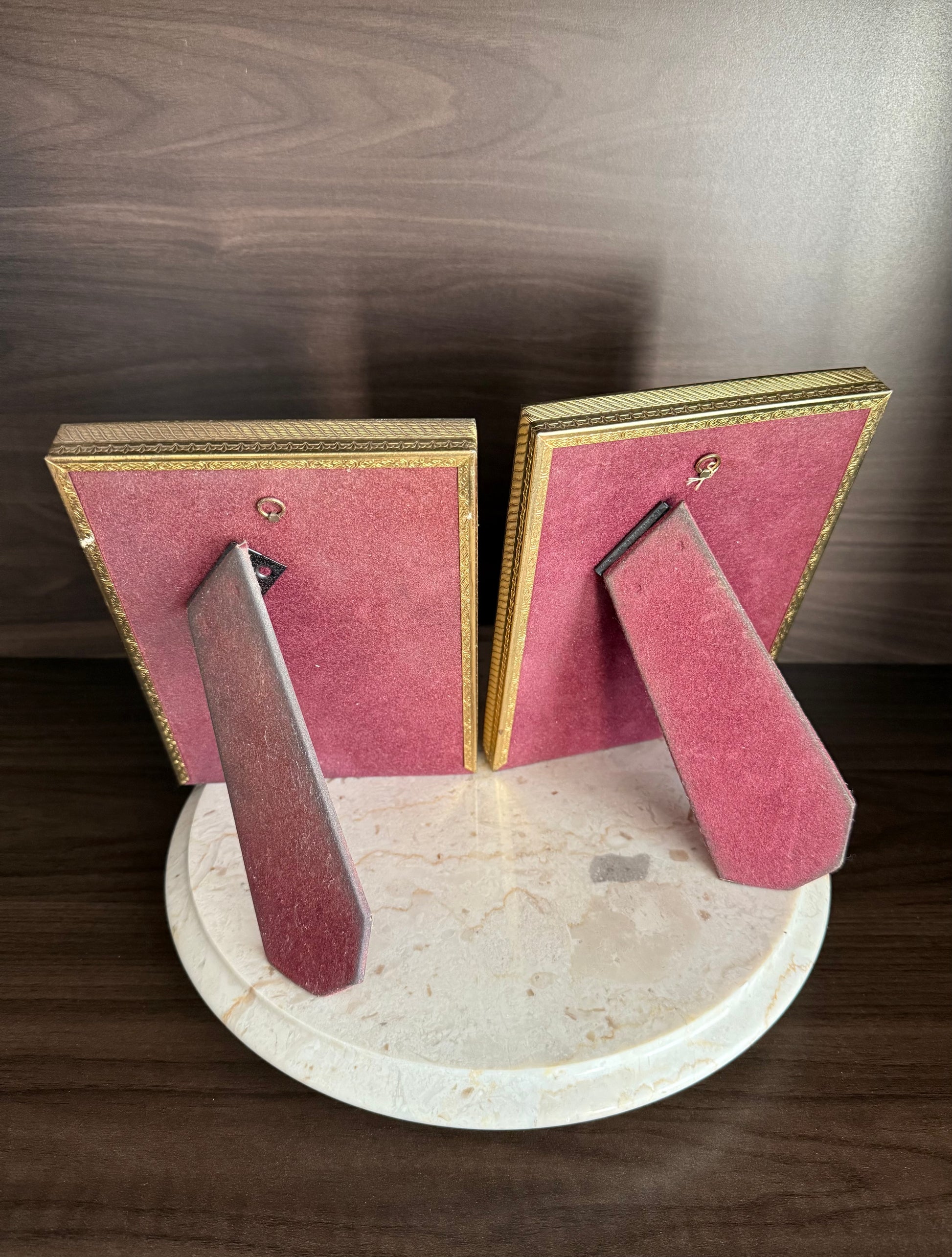 A pair of Metalcraft ornate beautiful gold-plated picture or photo frames.(2 pcs) These are in very good vintage condition. The burgundy velvet back of the picture frames (especially one of them) is a little worn due to the age of the product.