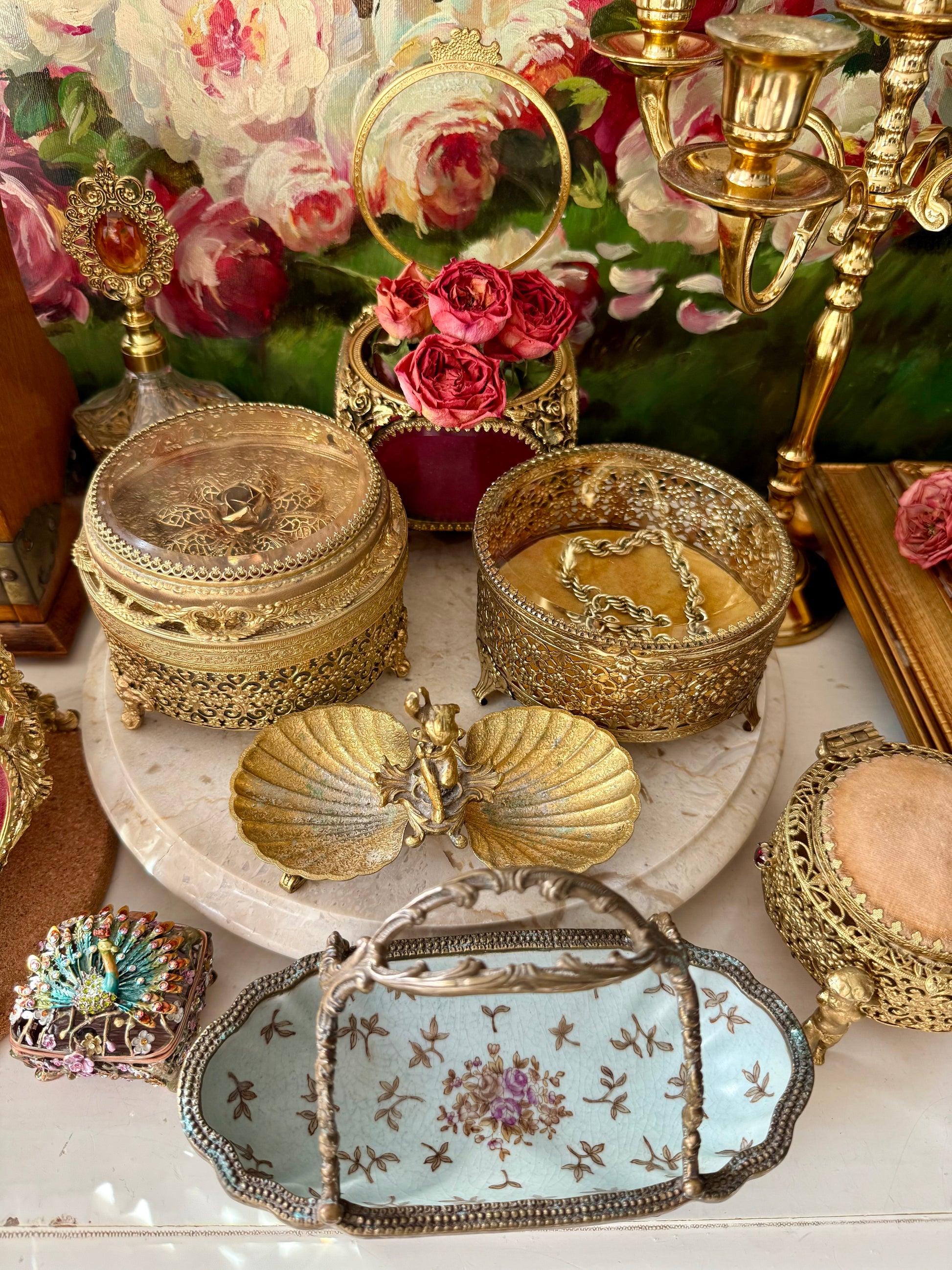 Art Nouveau style vintage porcelain crackle glazed footed basket trinket dish with (probably) bronze handle. It’s in very good vintage condition. Due to its age, the metal part is discolored in a few small places, but it is barely noticeable.