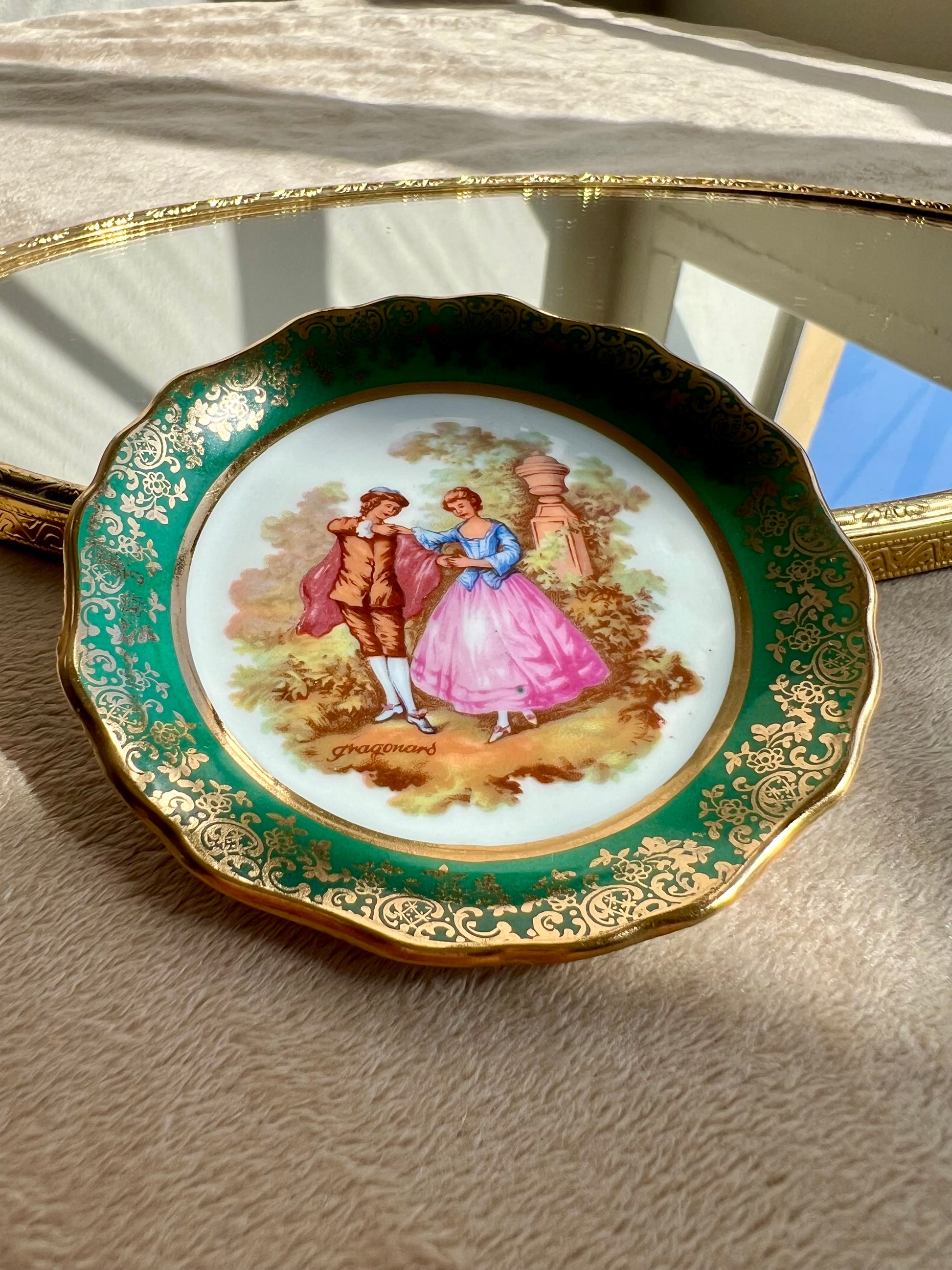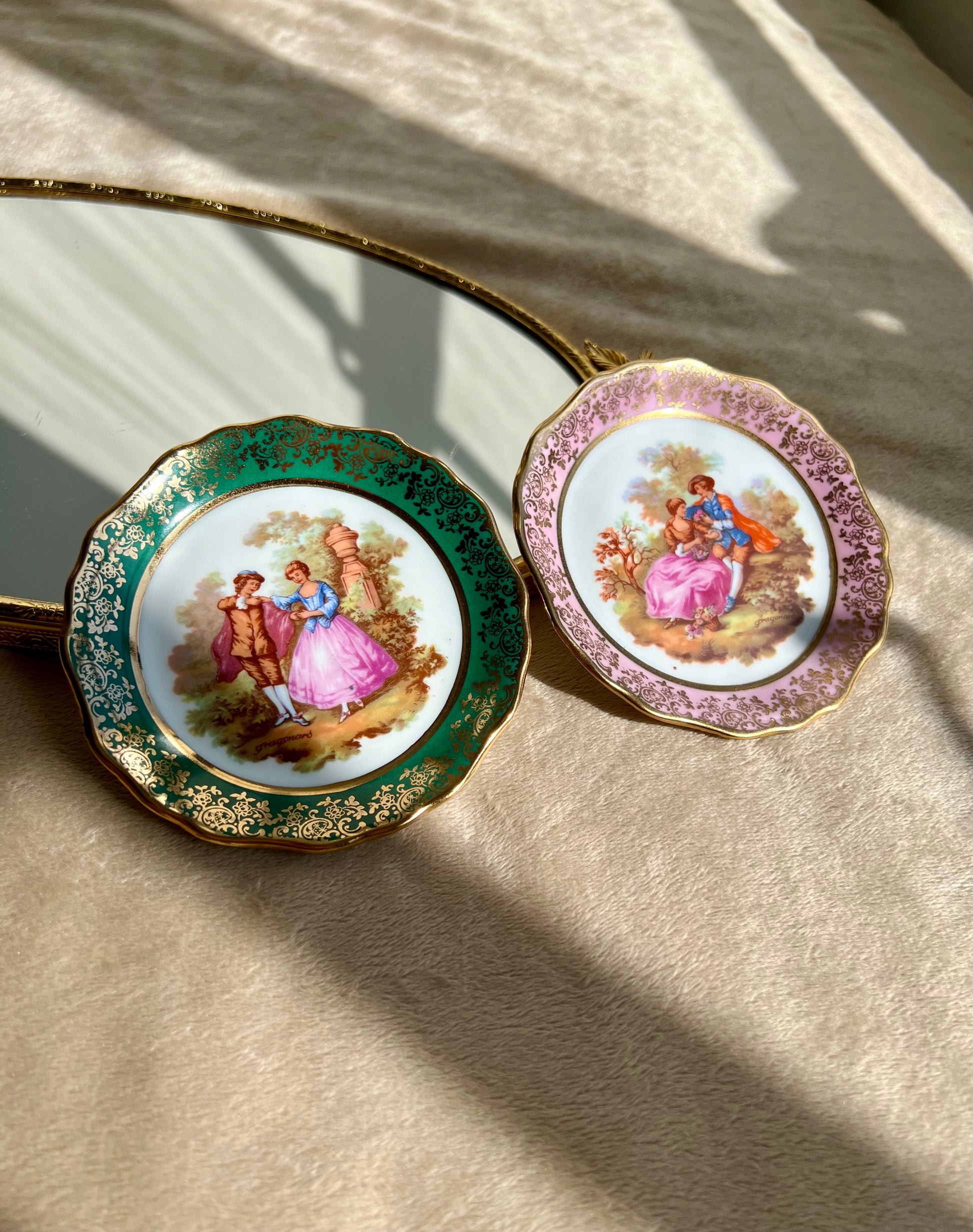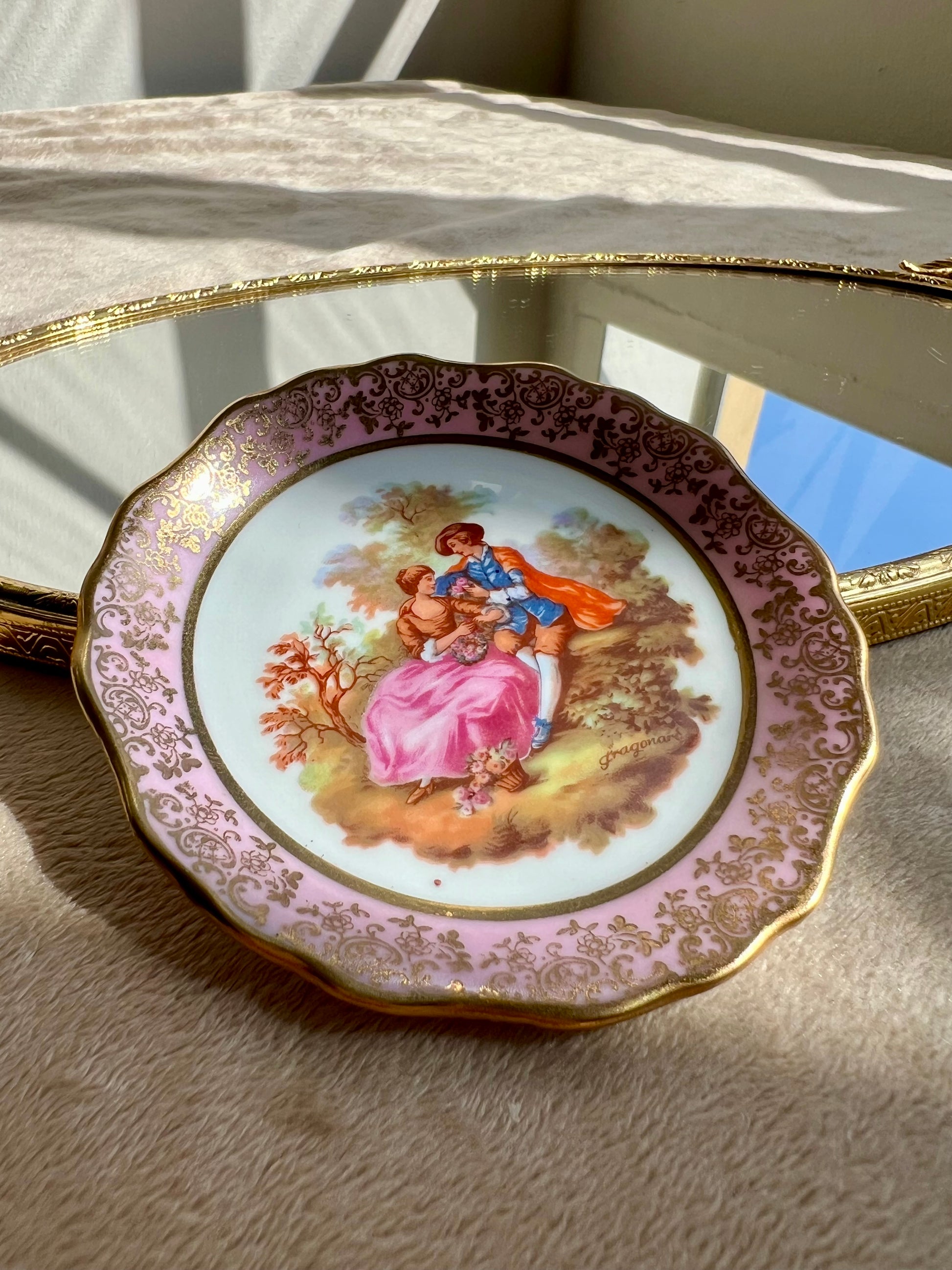 Miniature Vintage Limoges Fragonard Pink & Green Plates With a Courting Couple (2 pc)