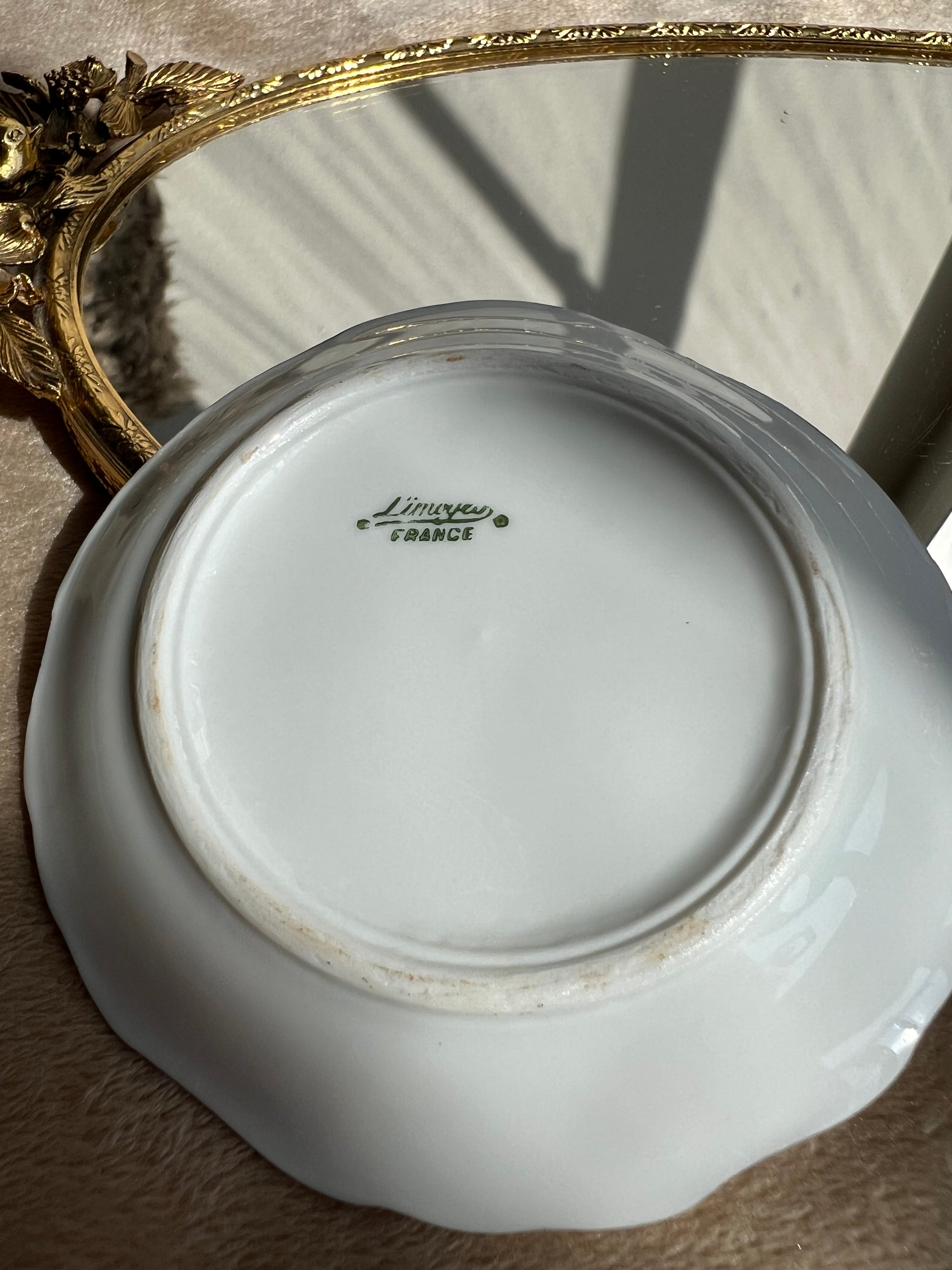 Miniature Limoges fragonard pink & green gold plates with brass wire display stand. Collectible Porcelain Mini Plates. Made in France. Excellent vintage condition without chips cracks, or damage. The bottom is stamped with the 'Limoges FRANCE' logo.