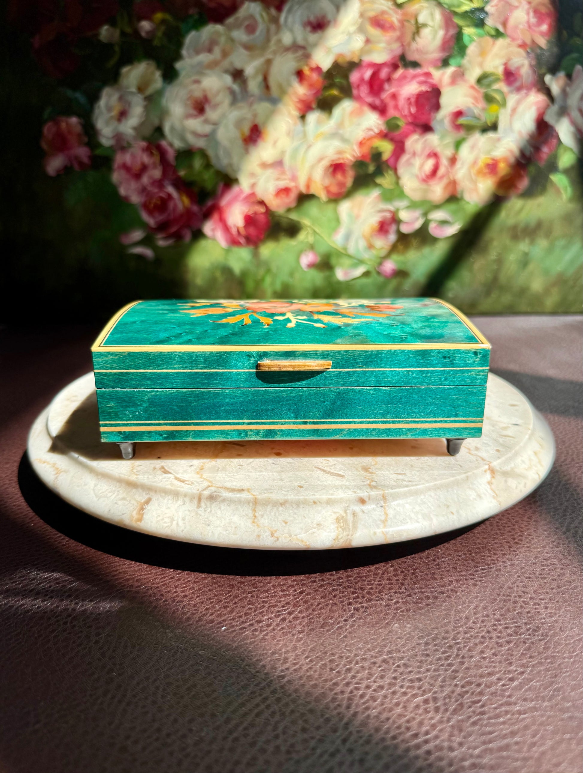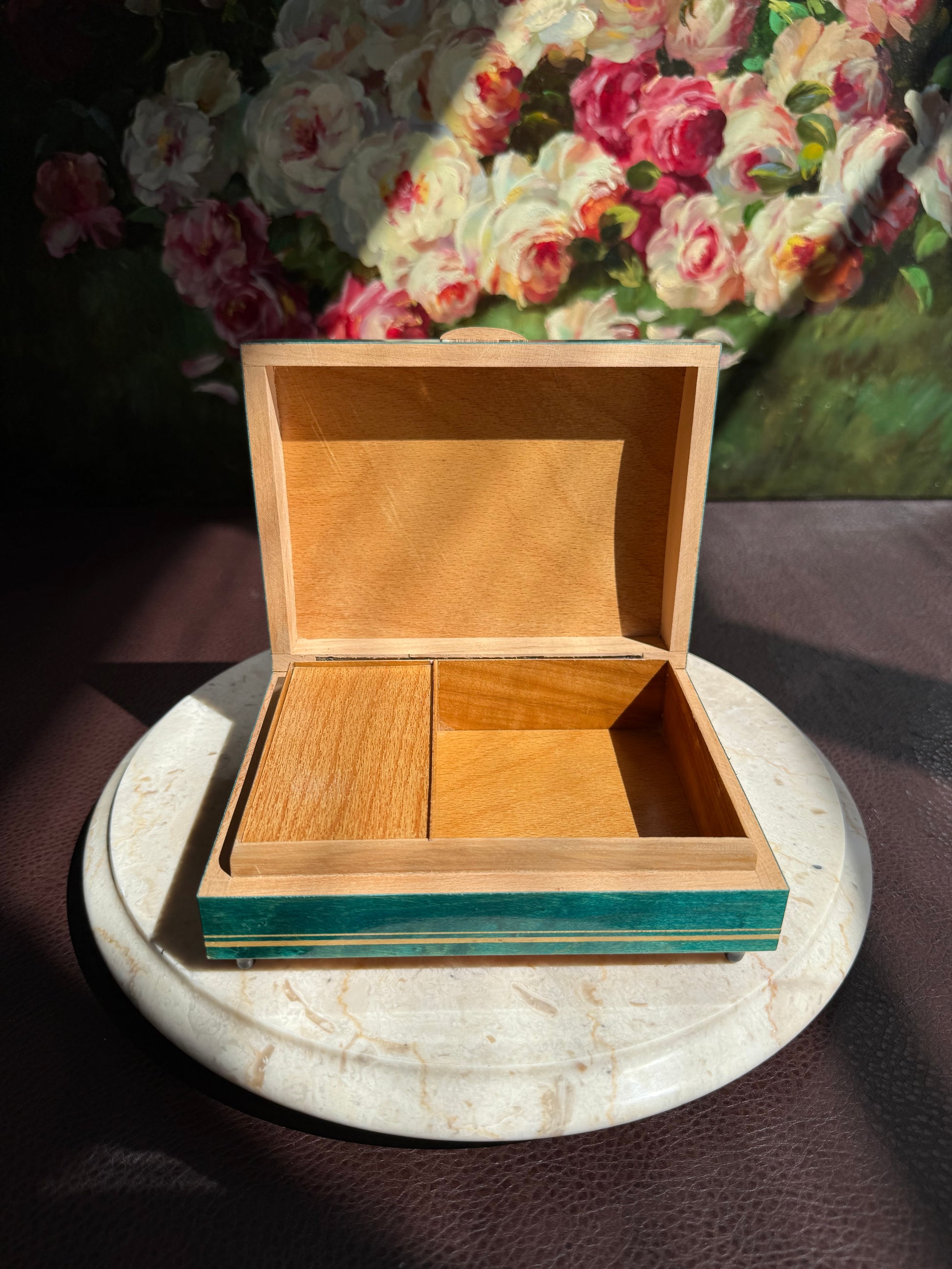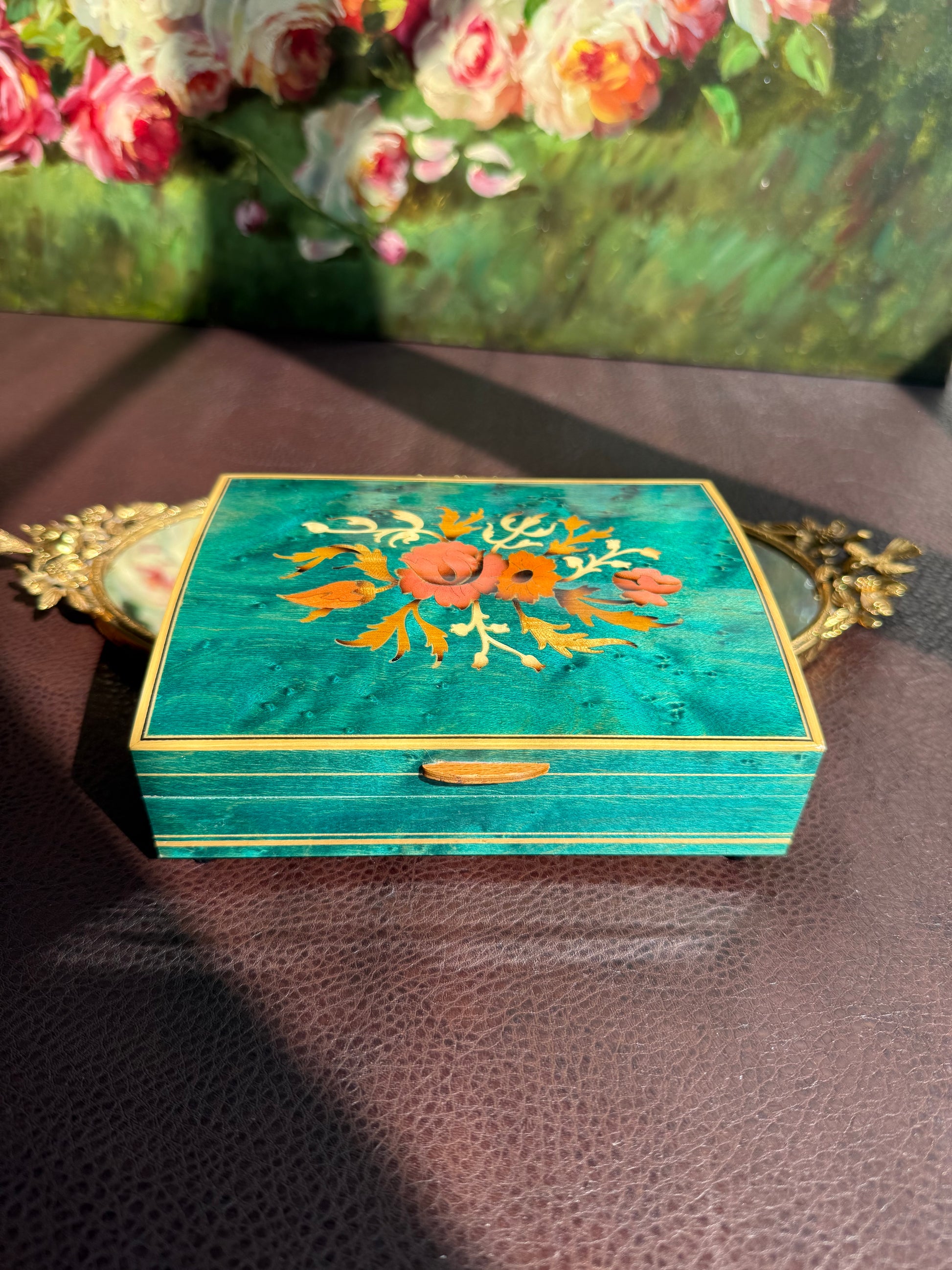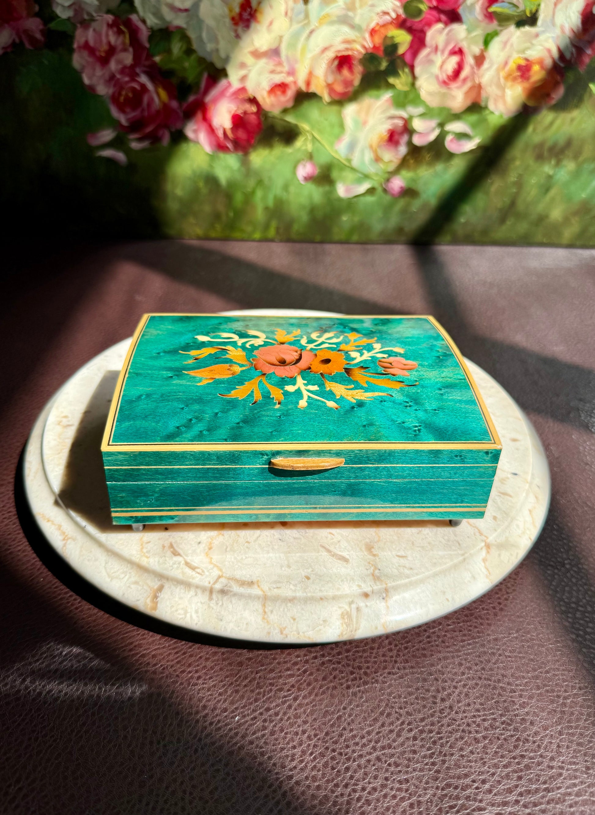 Beautiful vintage Swiss marquetry green wooden music and jewelry box from Reuge with floral decoration on the top lid. It’s in excellent vintage condition, working, playing “Laura’s Theme from Doctor Zhivago”. See photos for more details. Made in Switzerland. I think the music box plays music a little bit slower for me, but I'm no expert on music boxes. You can wind it up and it can play music.
