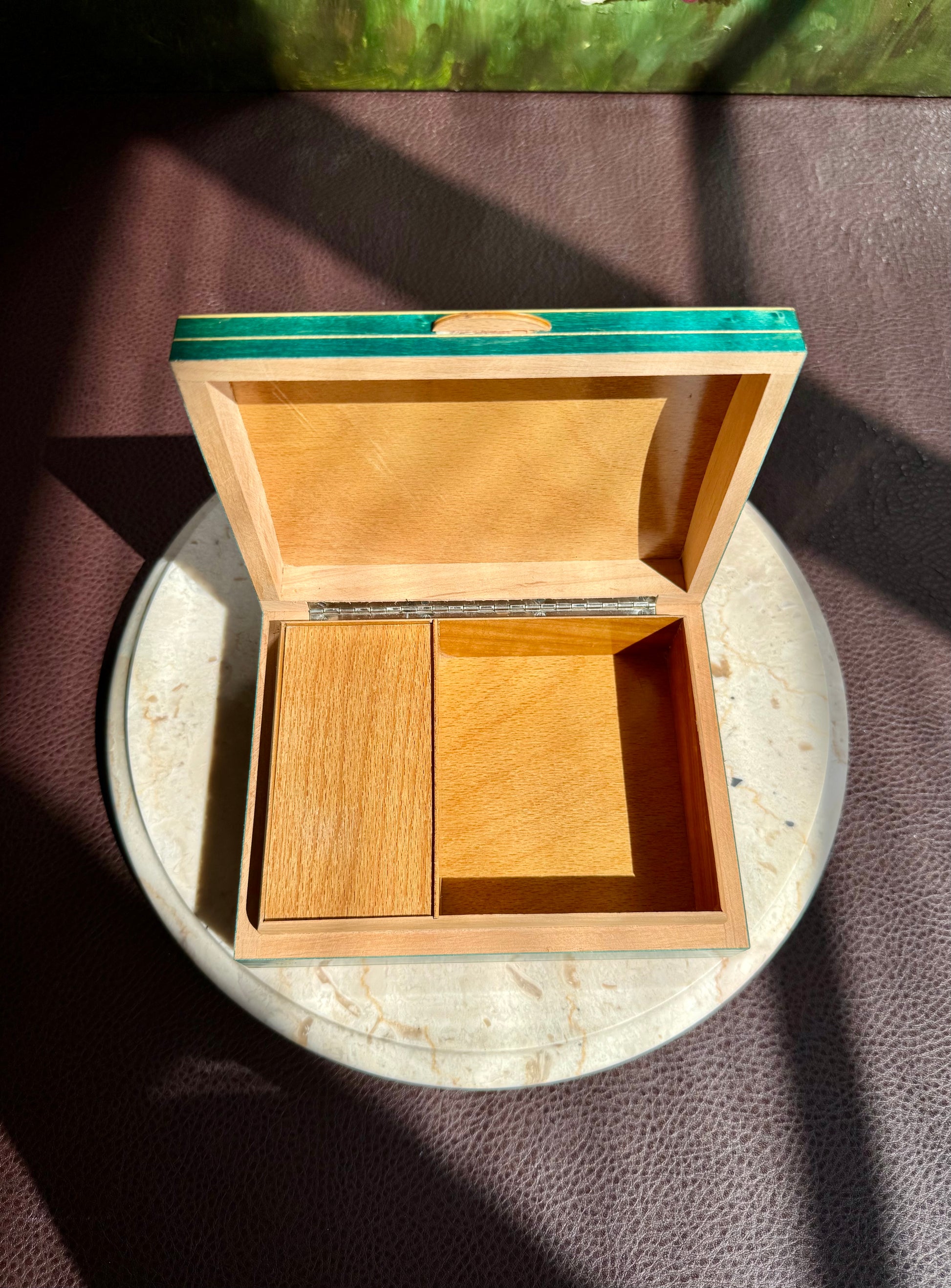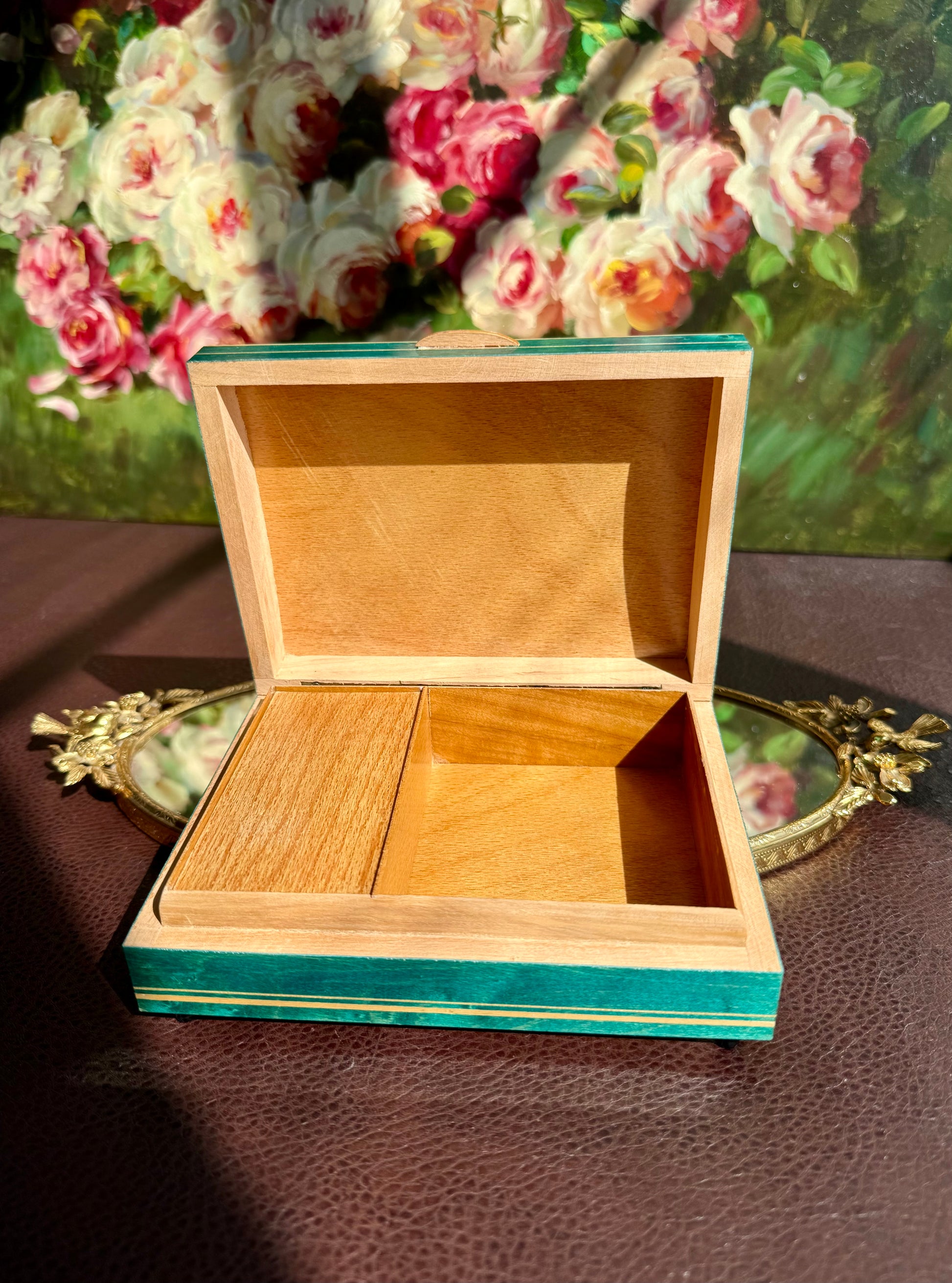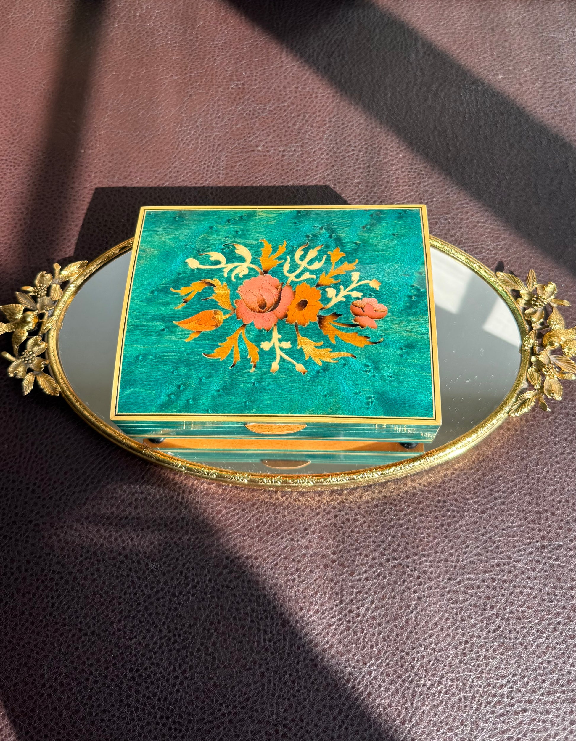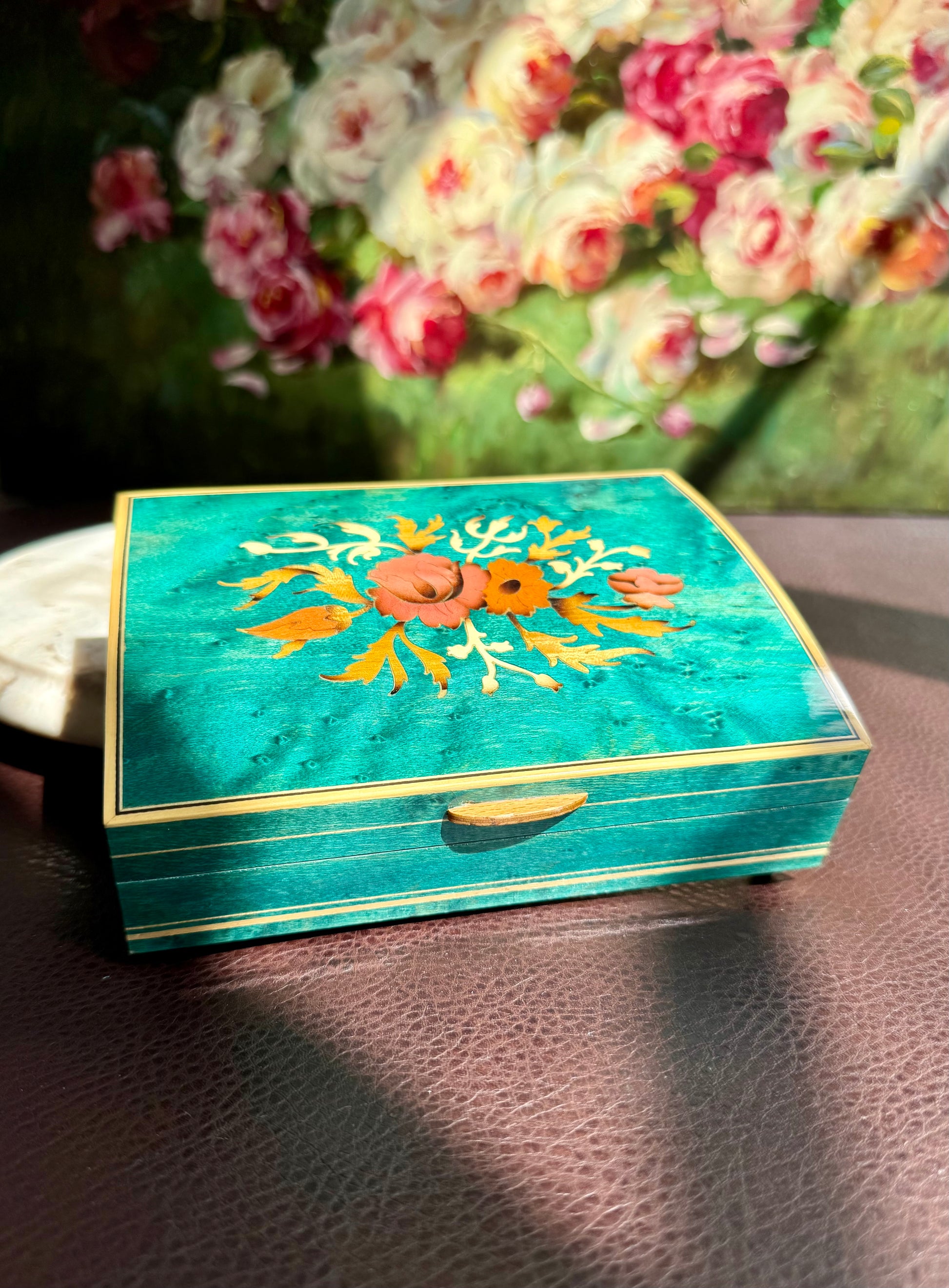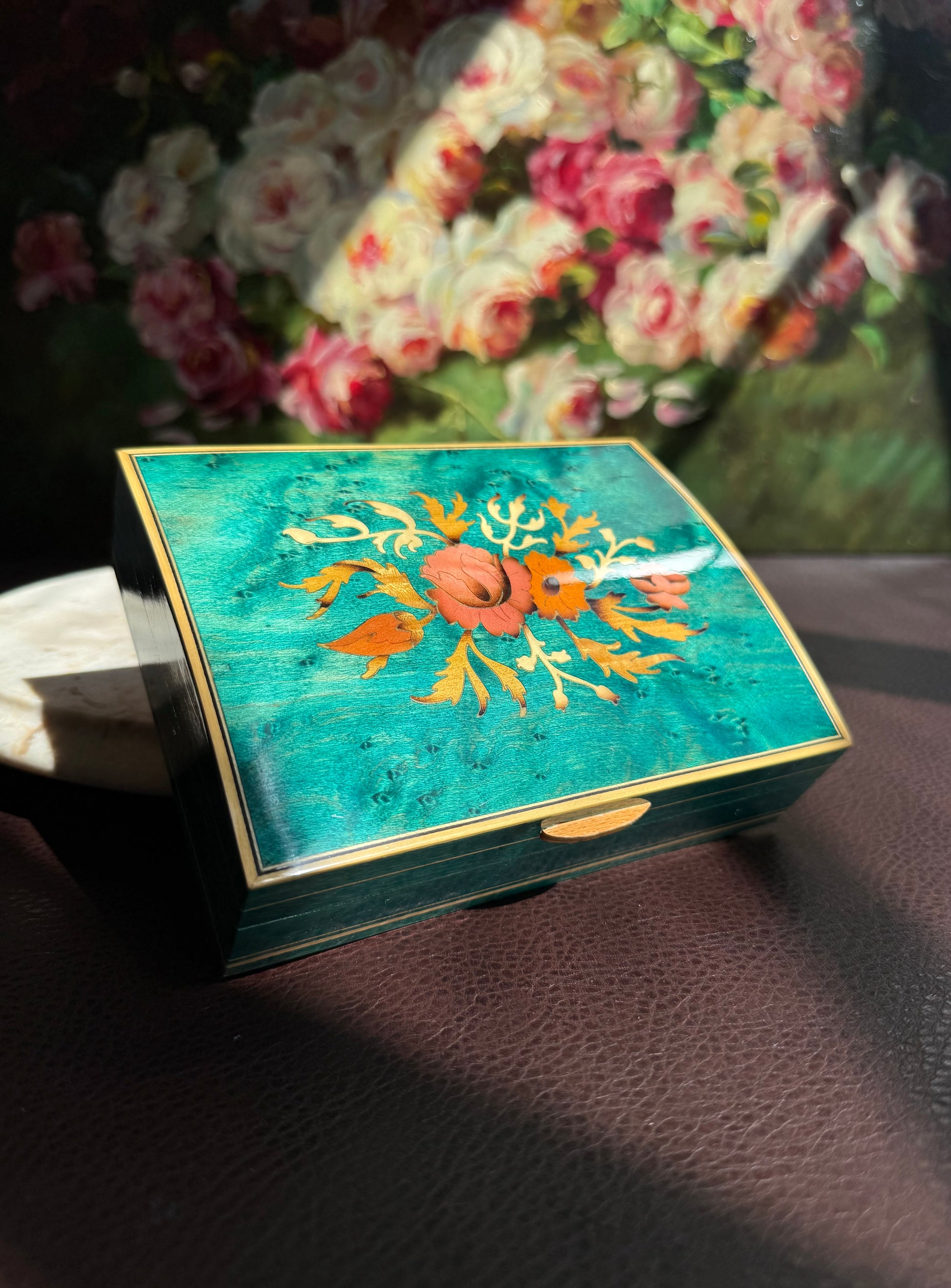 Beautiful vintage Swiss marquetry green wooden music and jewelry box from Reuge with floral decoration on the top lid. It’s in excellent vintage condition, working, playing “Laura’s Theme from Doctor Zhivago”. See photos for more details. Made in Switzerland. I think the music box plays music a little bit slower for me, but I'm no expert on music boxes. You can wind it up and it can play music.