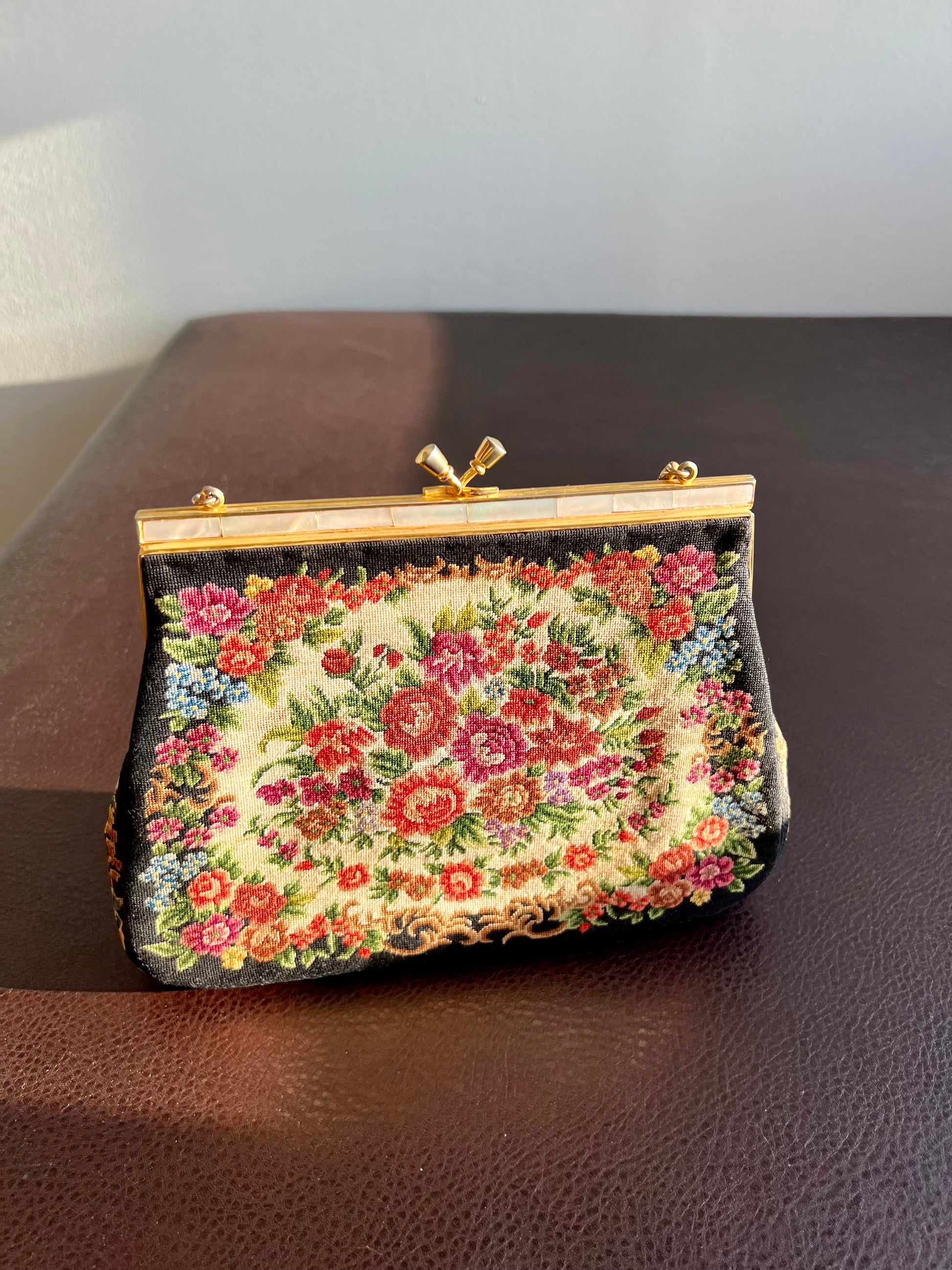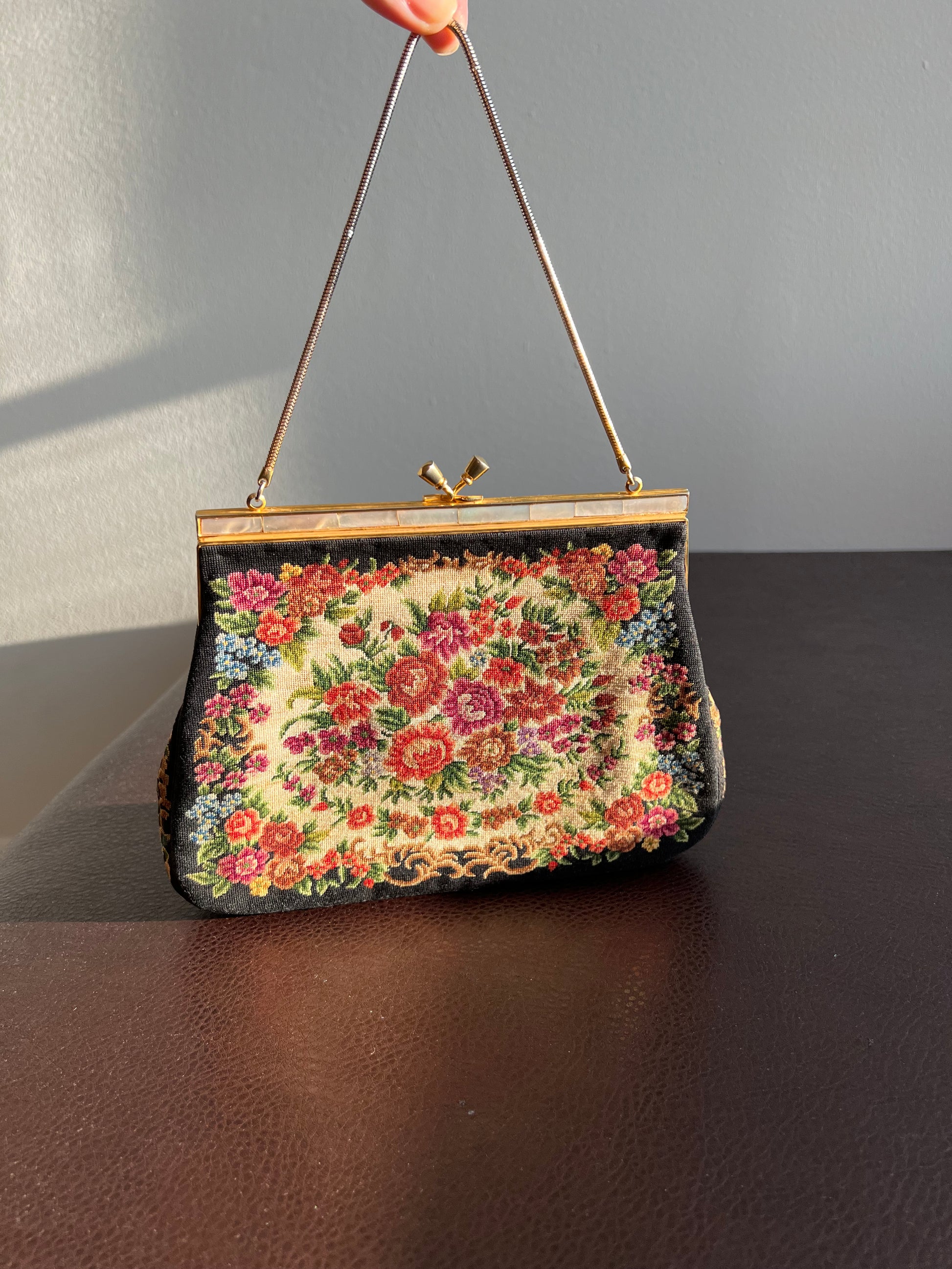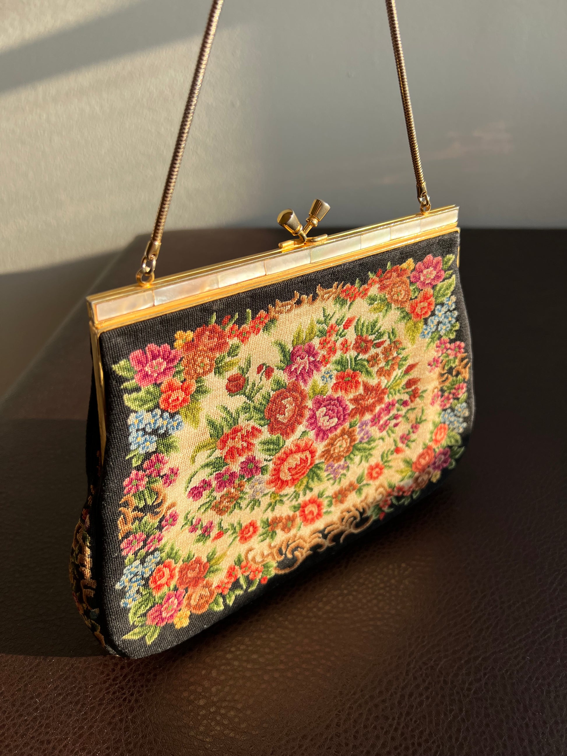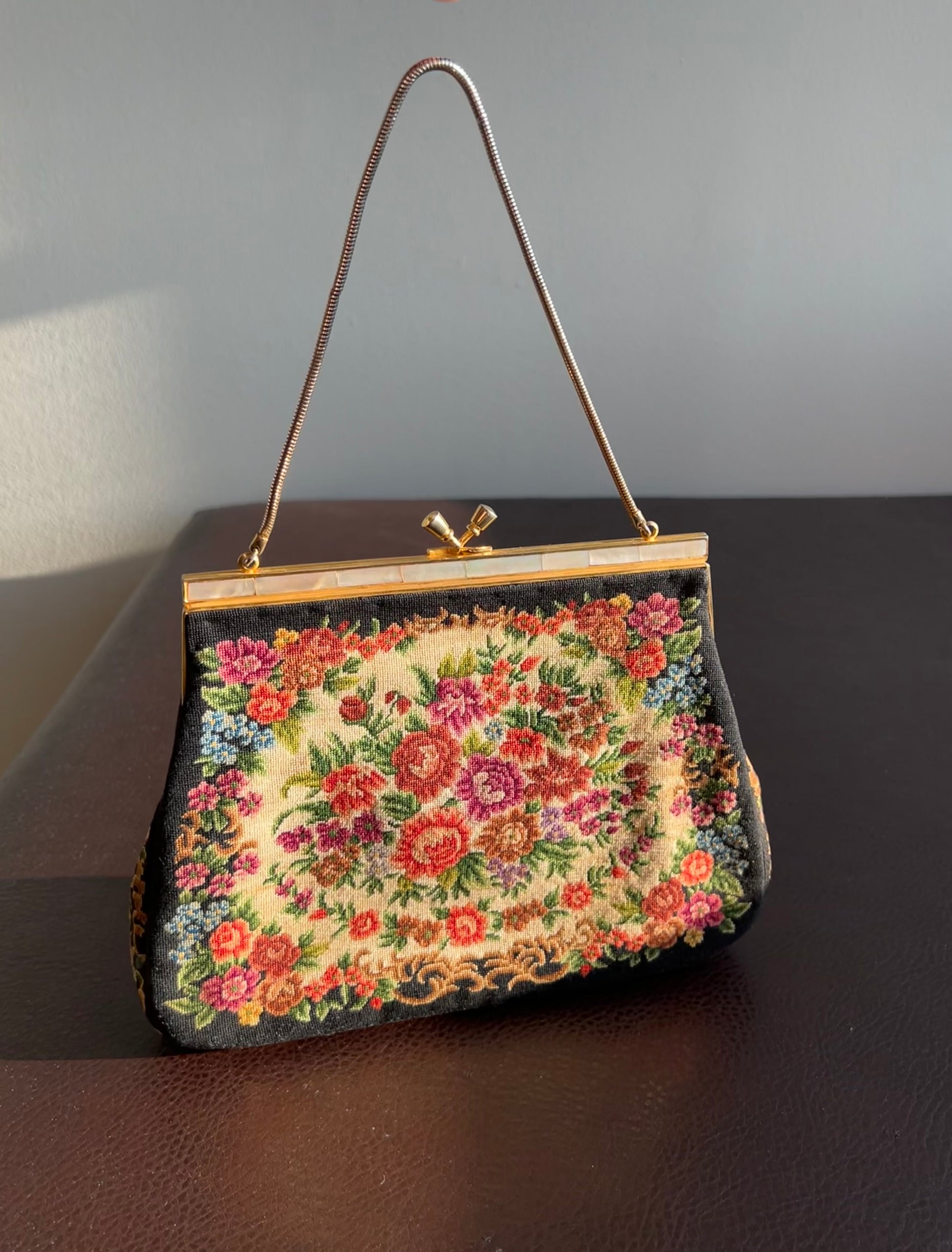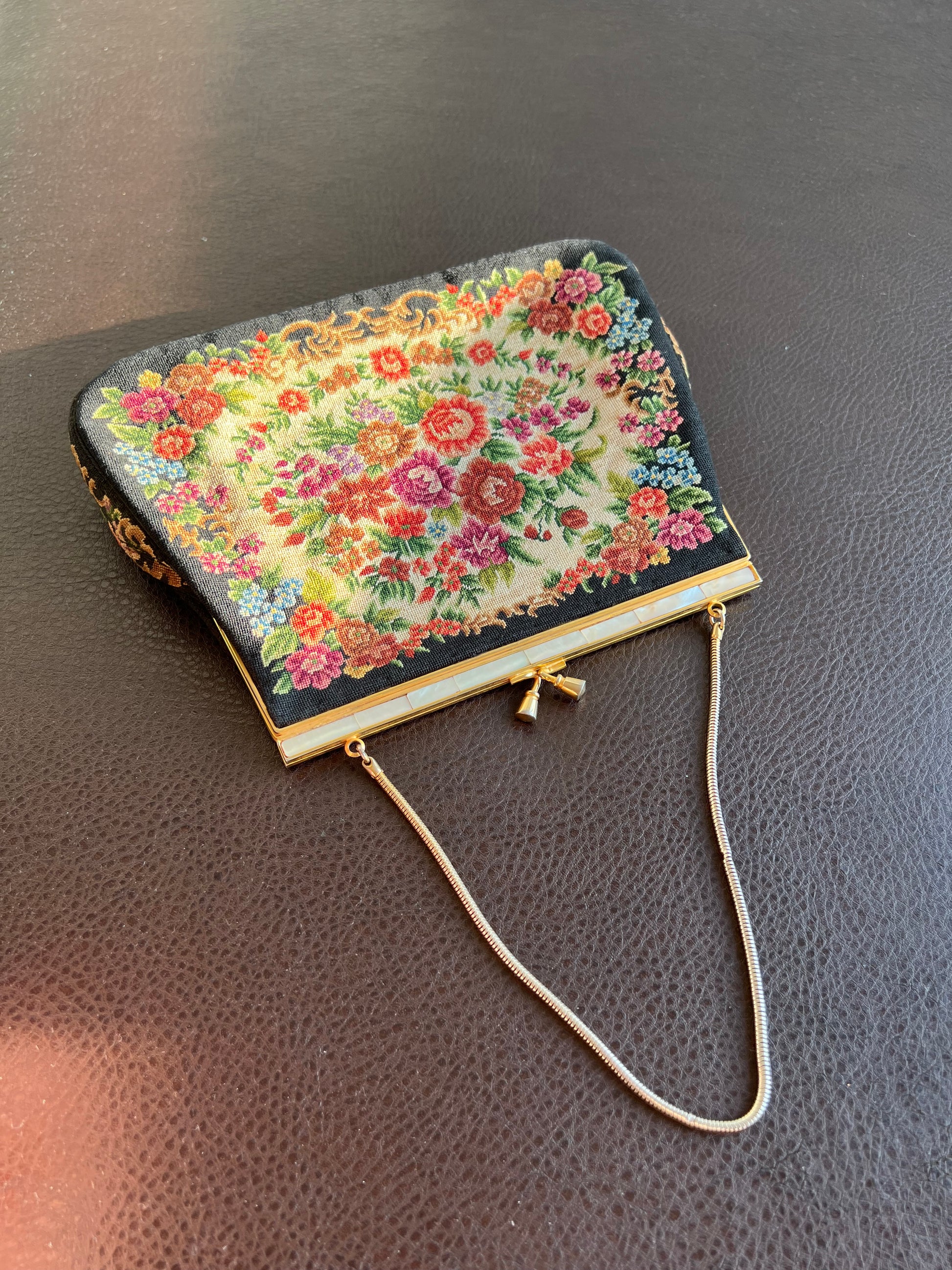 Beautiful vintage tapestry handbag/ evening bag with blooming roses of many colors and shades. Mother of pearl edge with a snake shiny metal chain handle. The gold part of frame have very light tarnish from age. Interior is dark red (Burgundy) satin with one small pocket on the side. It’s in excellent vintage condition.