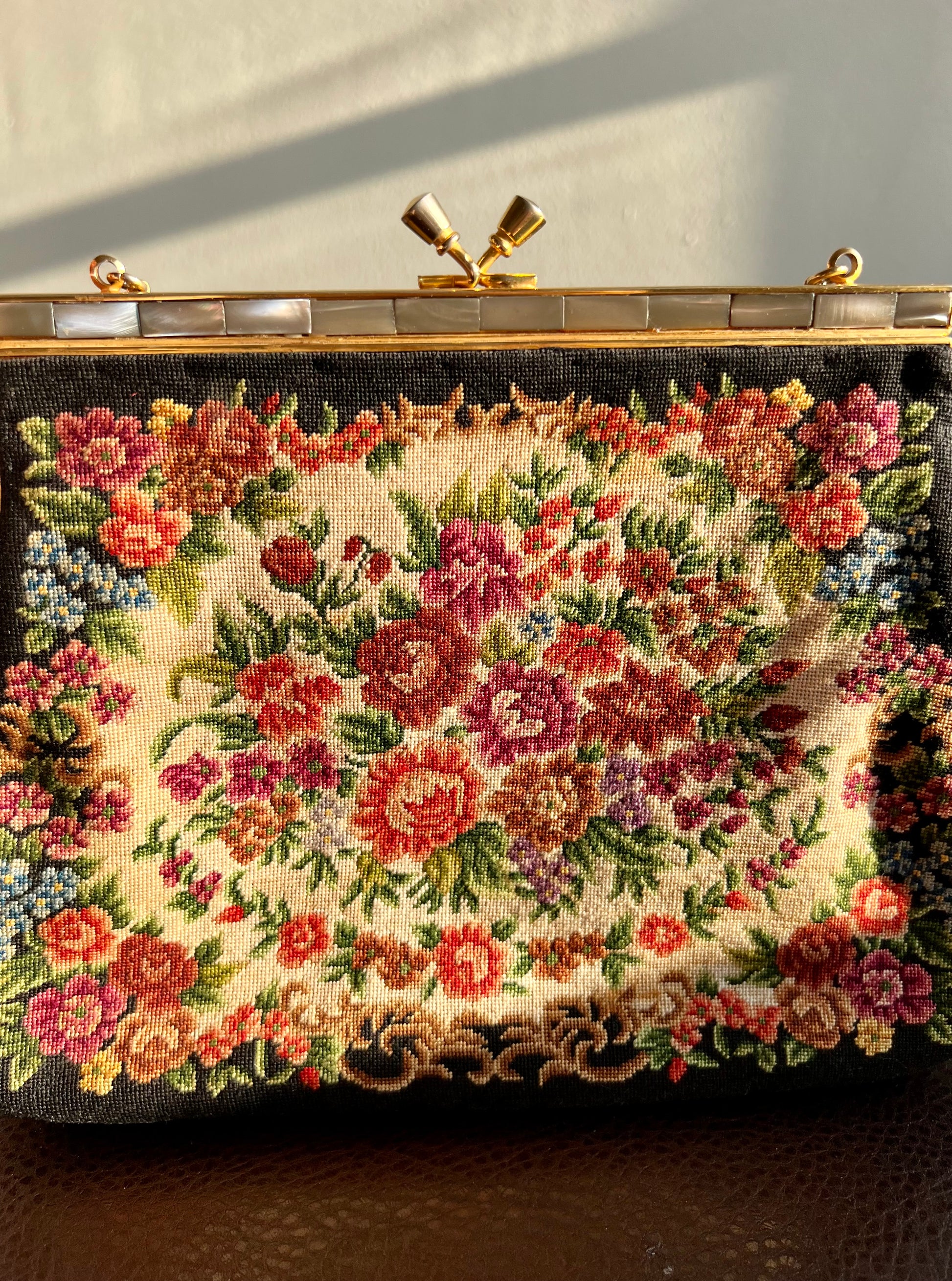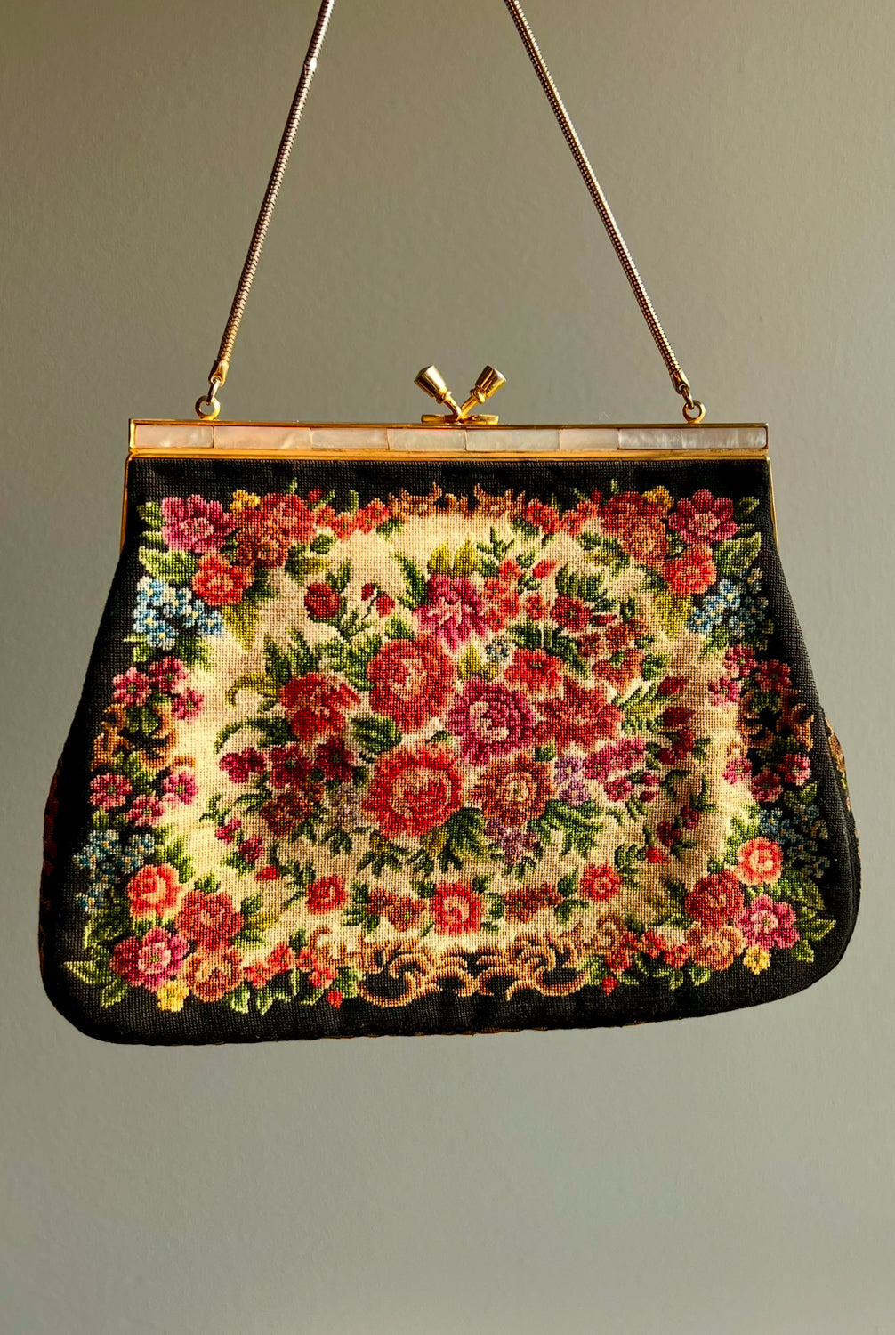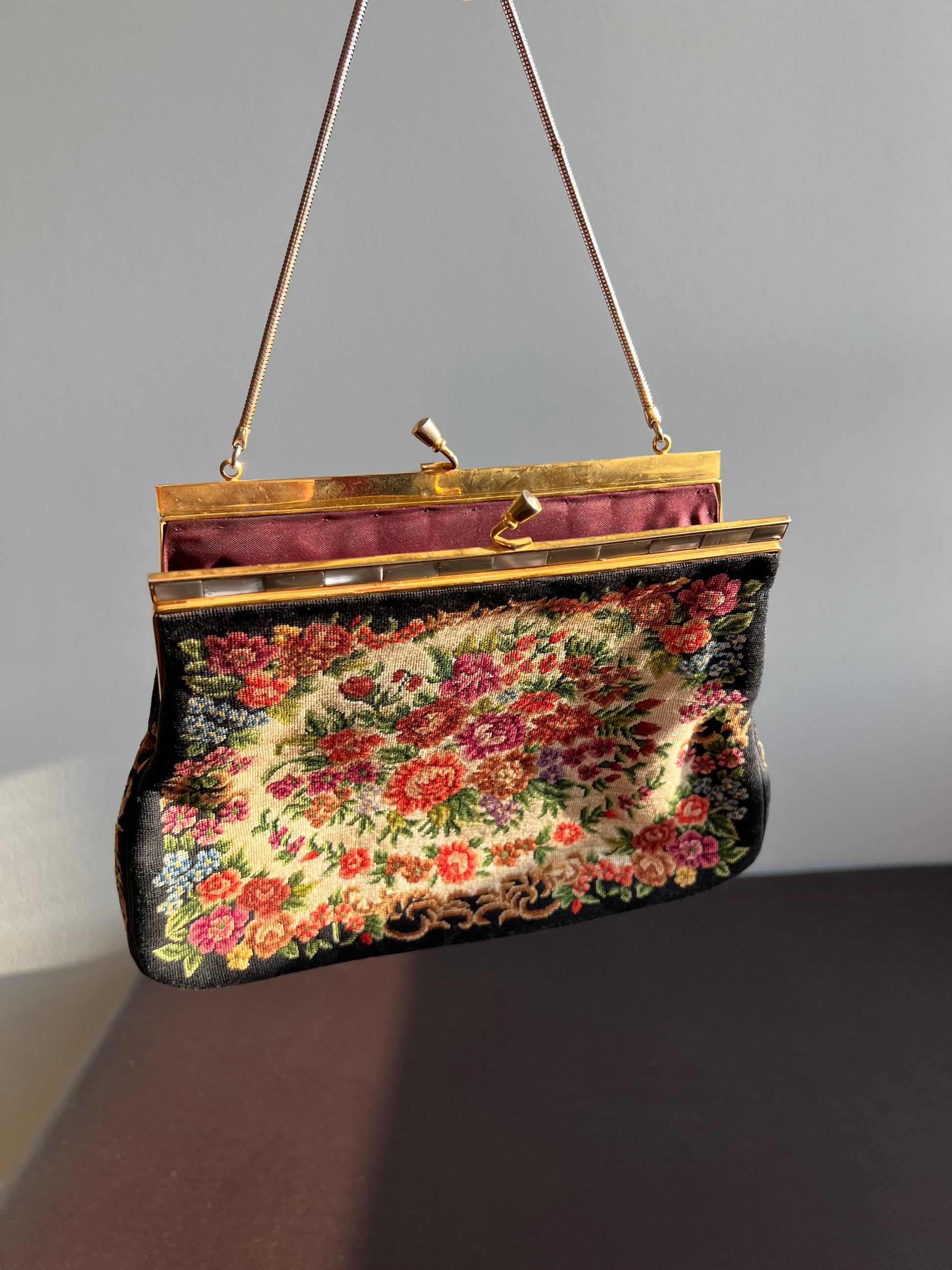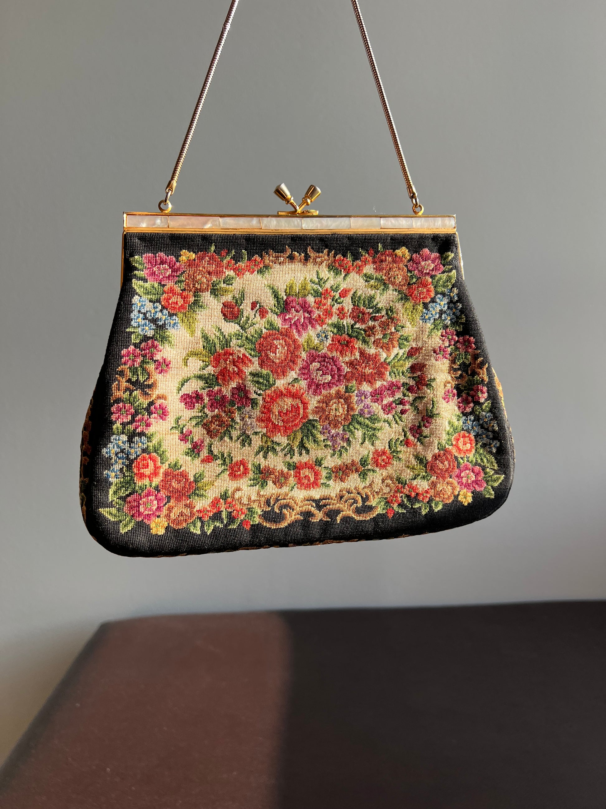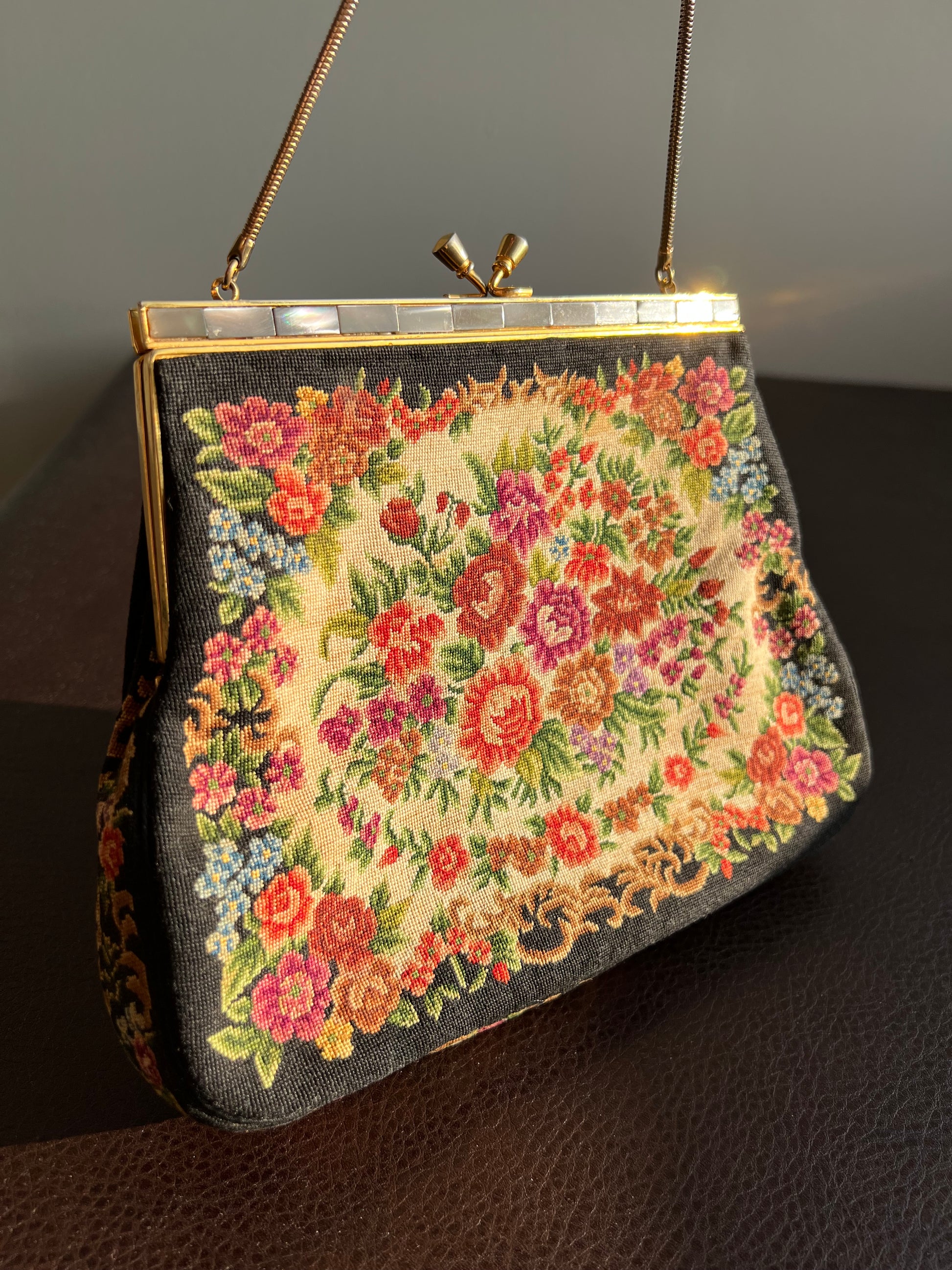 Beautiful vintage tapestry handbag/ evening bag with blooming roses of many colors and shades. Mother of pearl edge with a snake shiny metal chain handle. The gold part of frame have very light tarnish from age. Interior is dark red (Burgundy) satin with one small pocket on the side. It’s in excellent vintage condition.