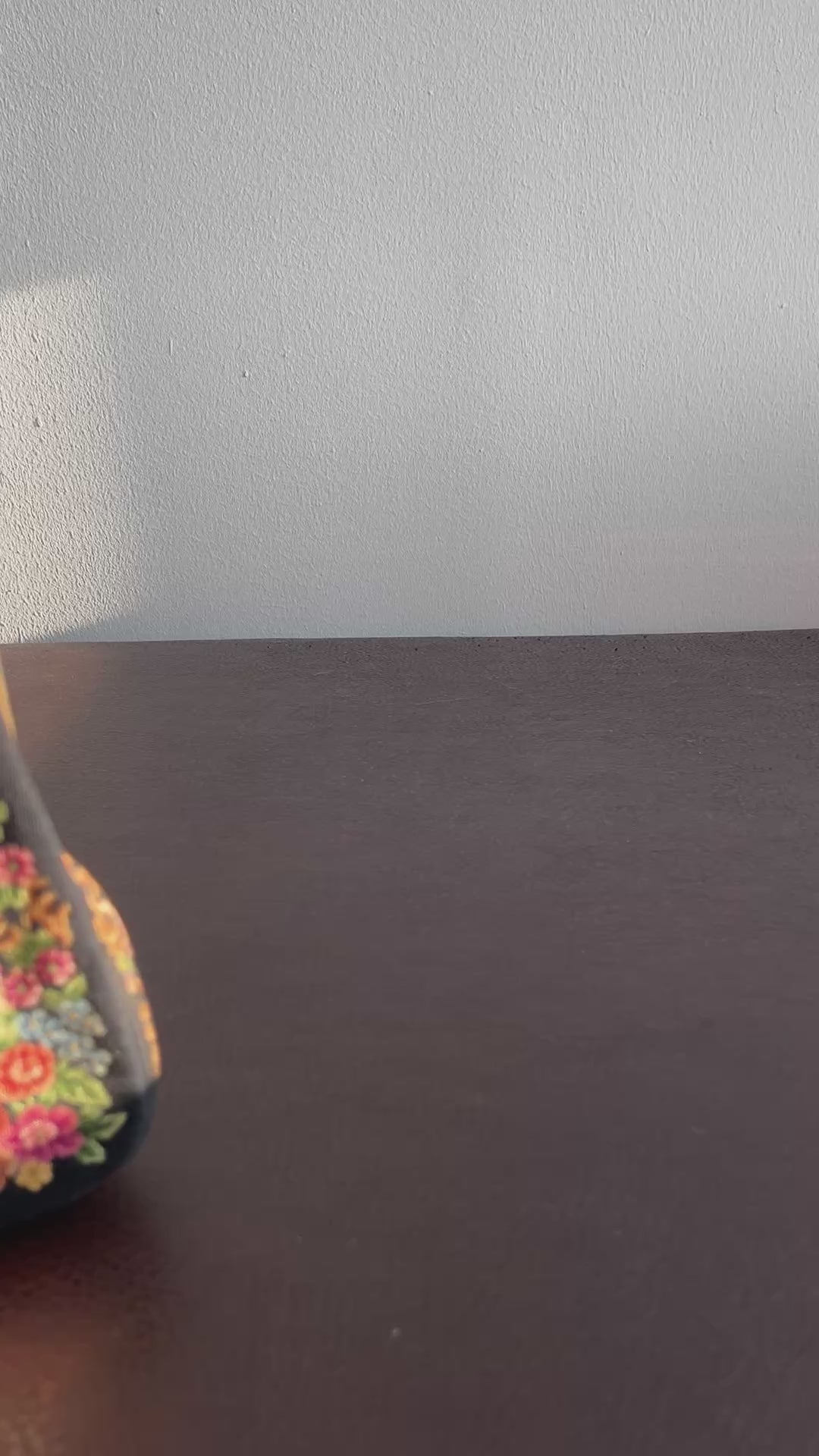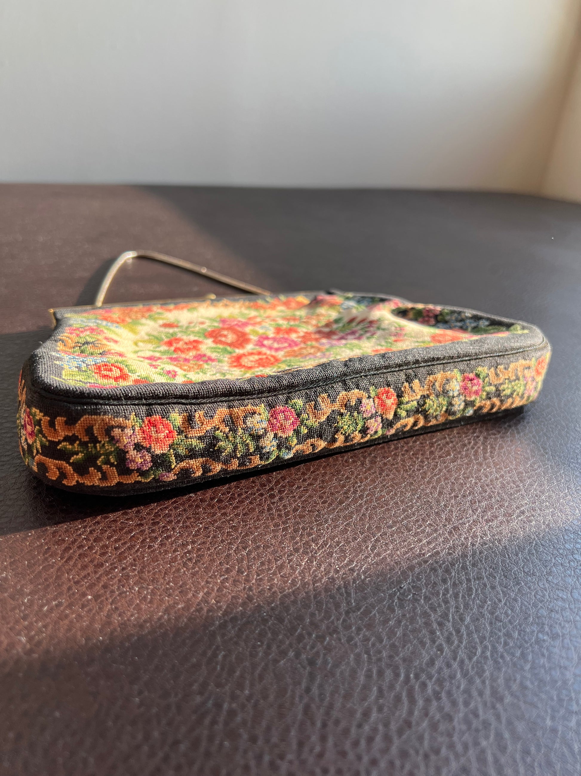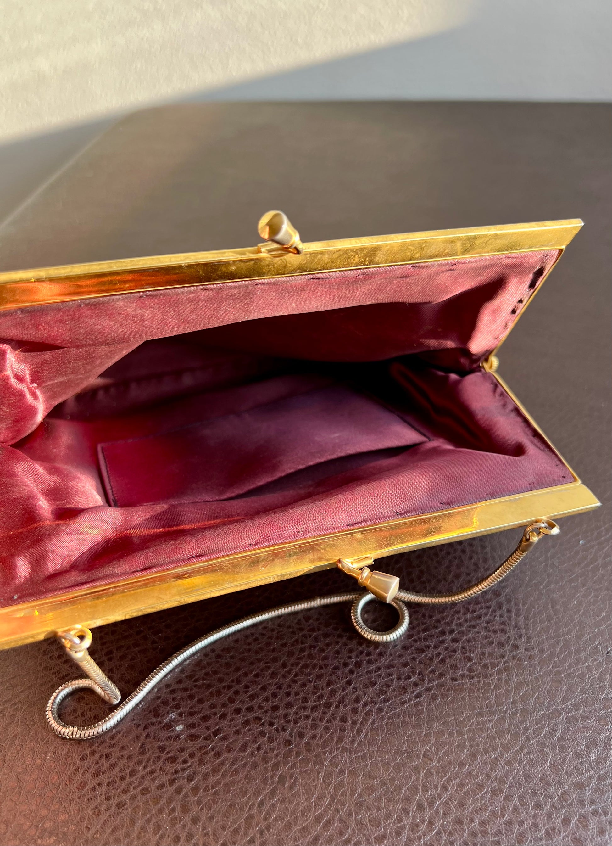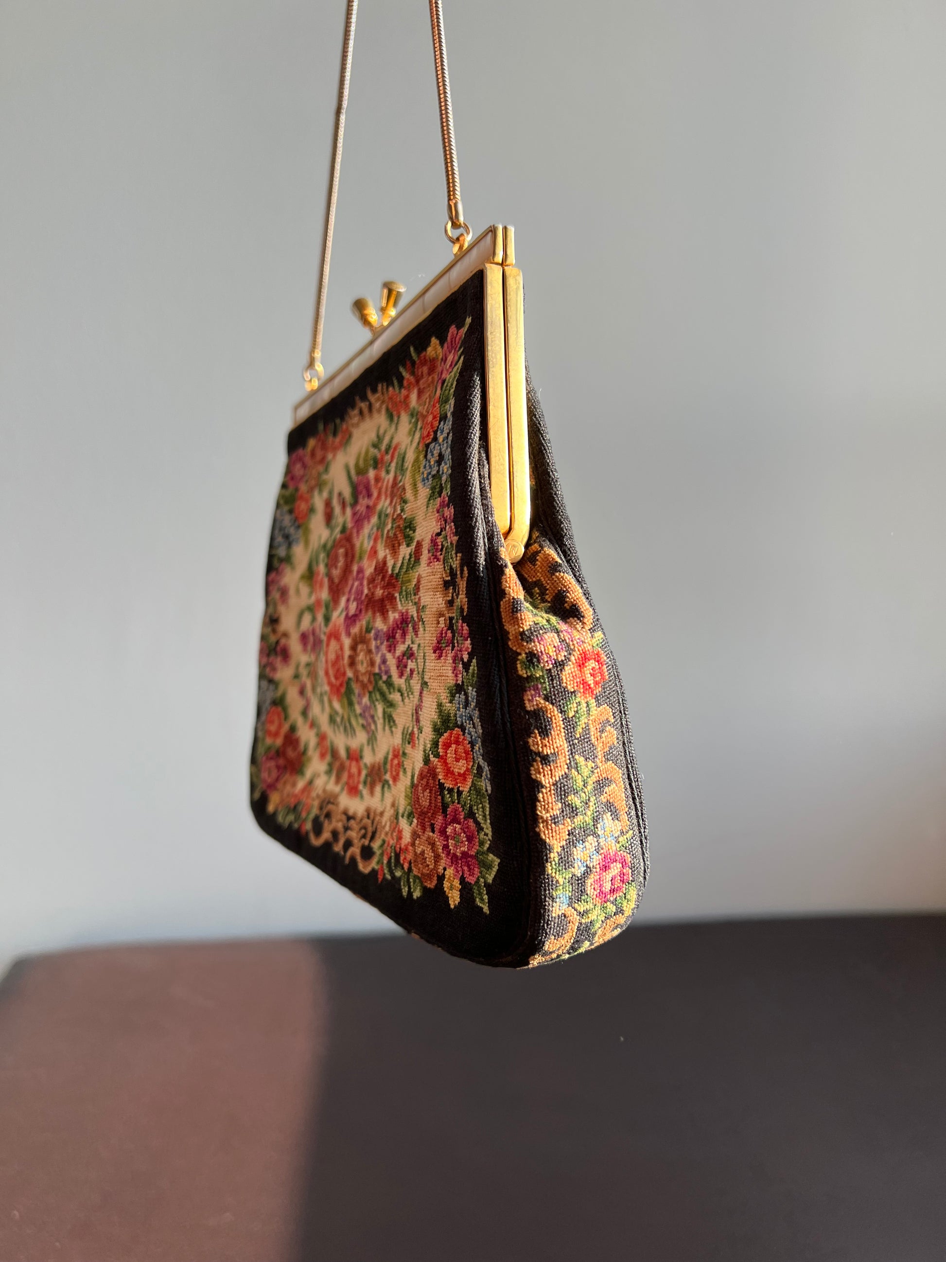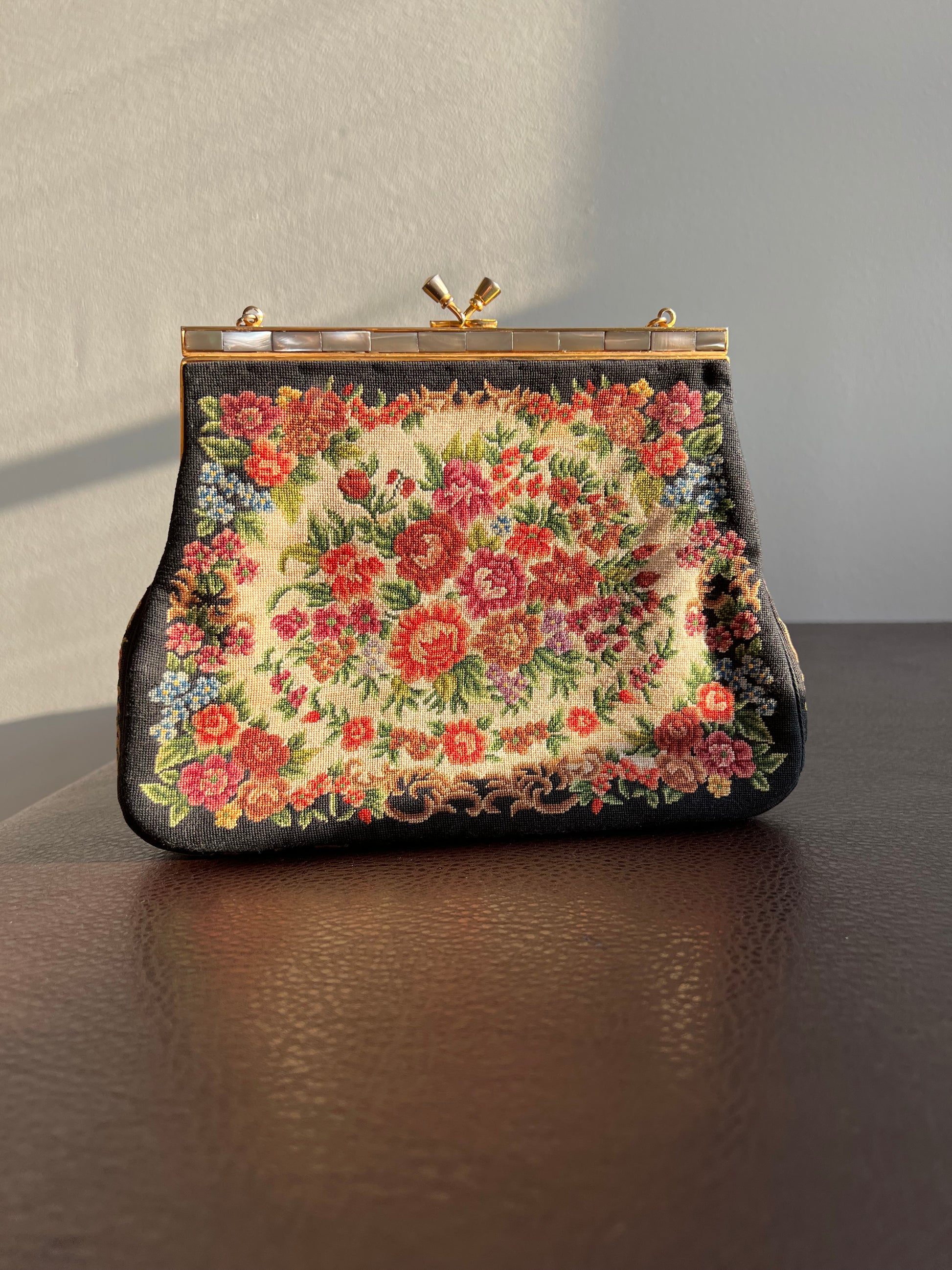 Beautiful vintage tapestry handbag/ evening bag with blooming roses of many colors and shades. Mother of pearl edge with a snake shiny metal chain handle. The gold part of frame have very light tarnish from age. Interior is dark red (Burgundy) satin with one small pocket on the side. It’s in excellent vintage condition.