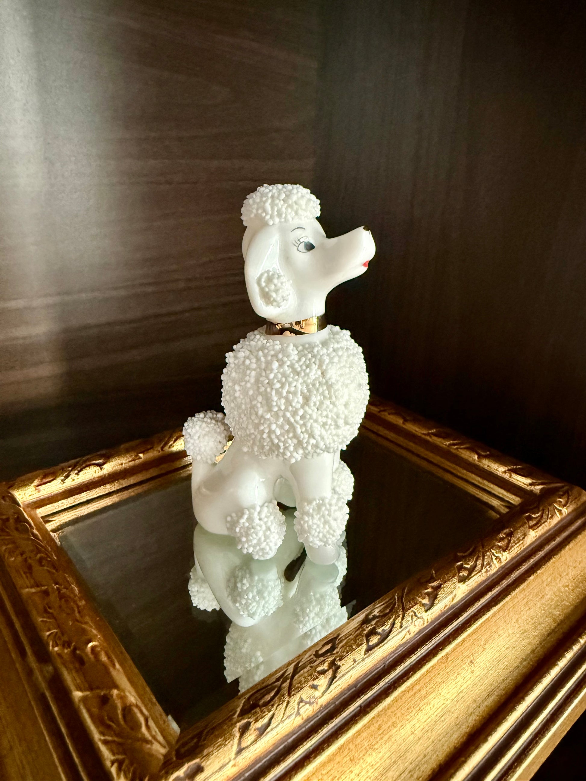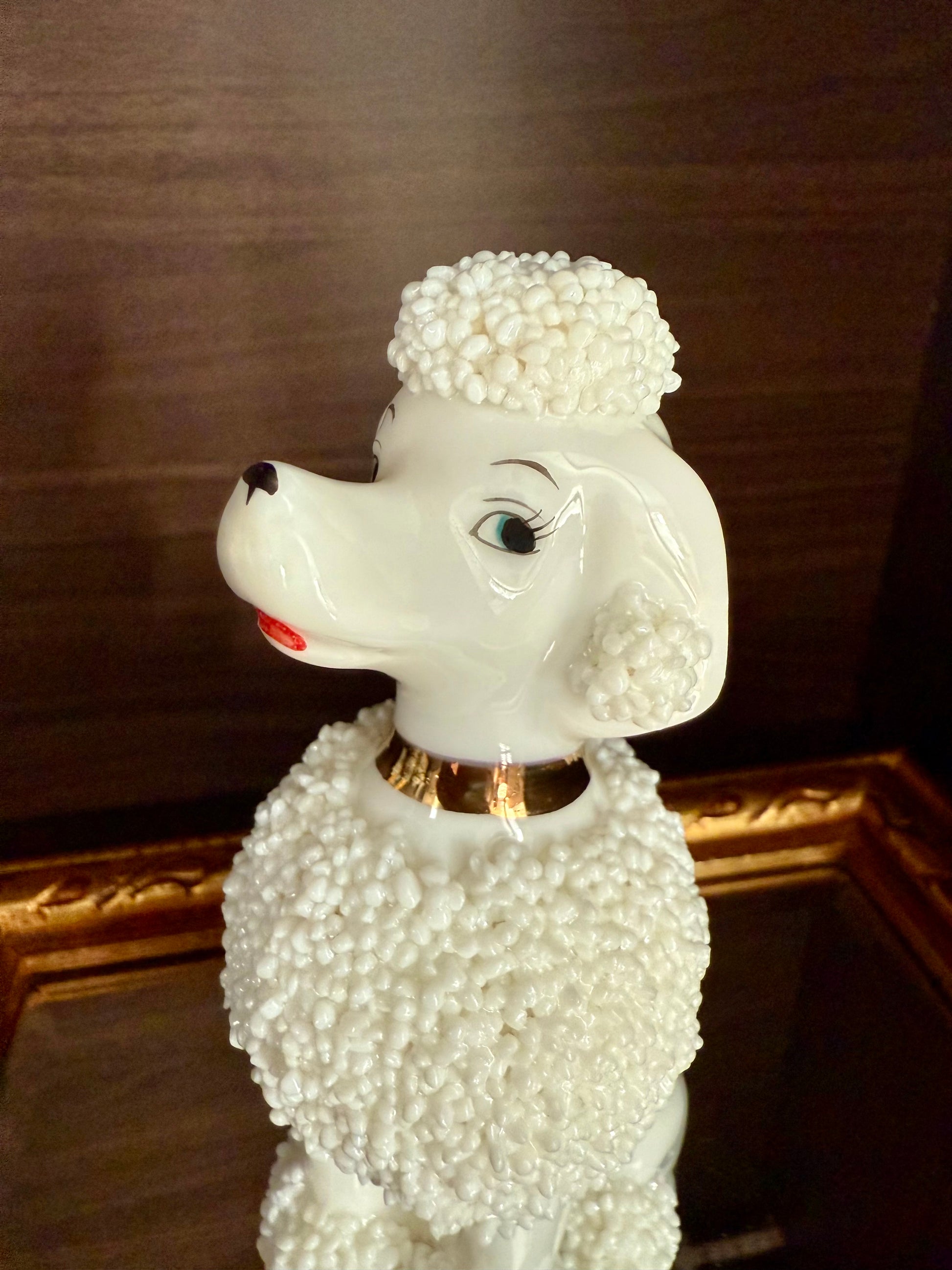 Beautiful vintage (probably) Lefton white porcelain spaghetti or sugar Poodle figurine dog from the 1960s or 1970s. The porcelain is numbered. It’s in excellent vintage condition. Made in Japan.