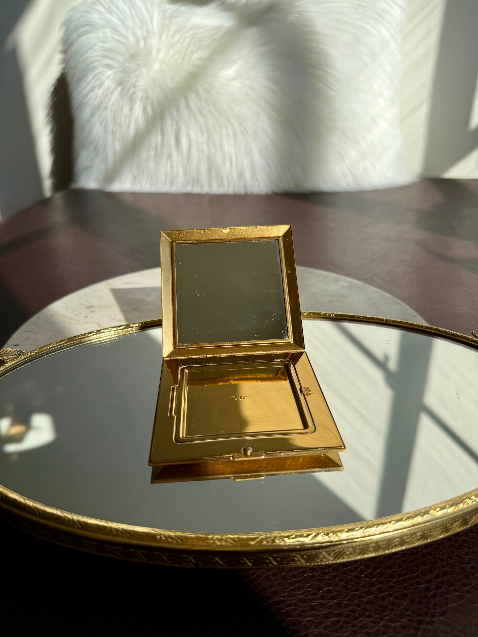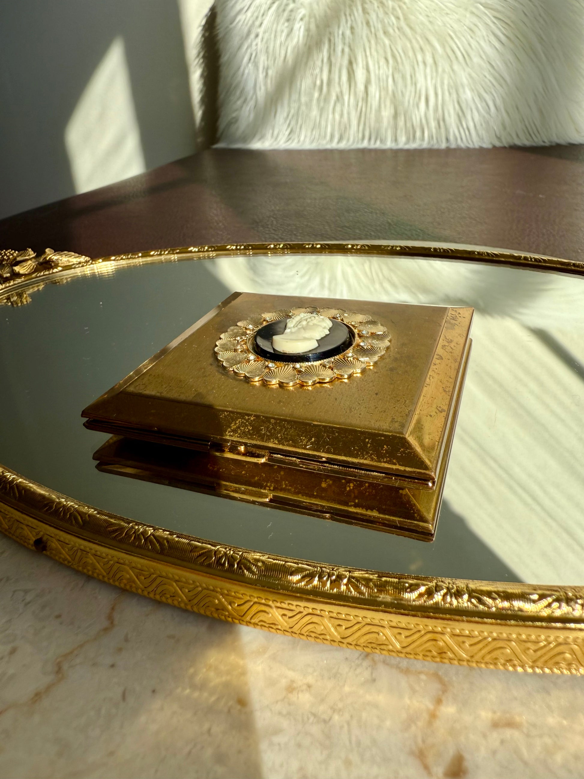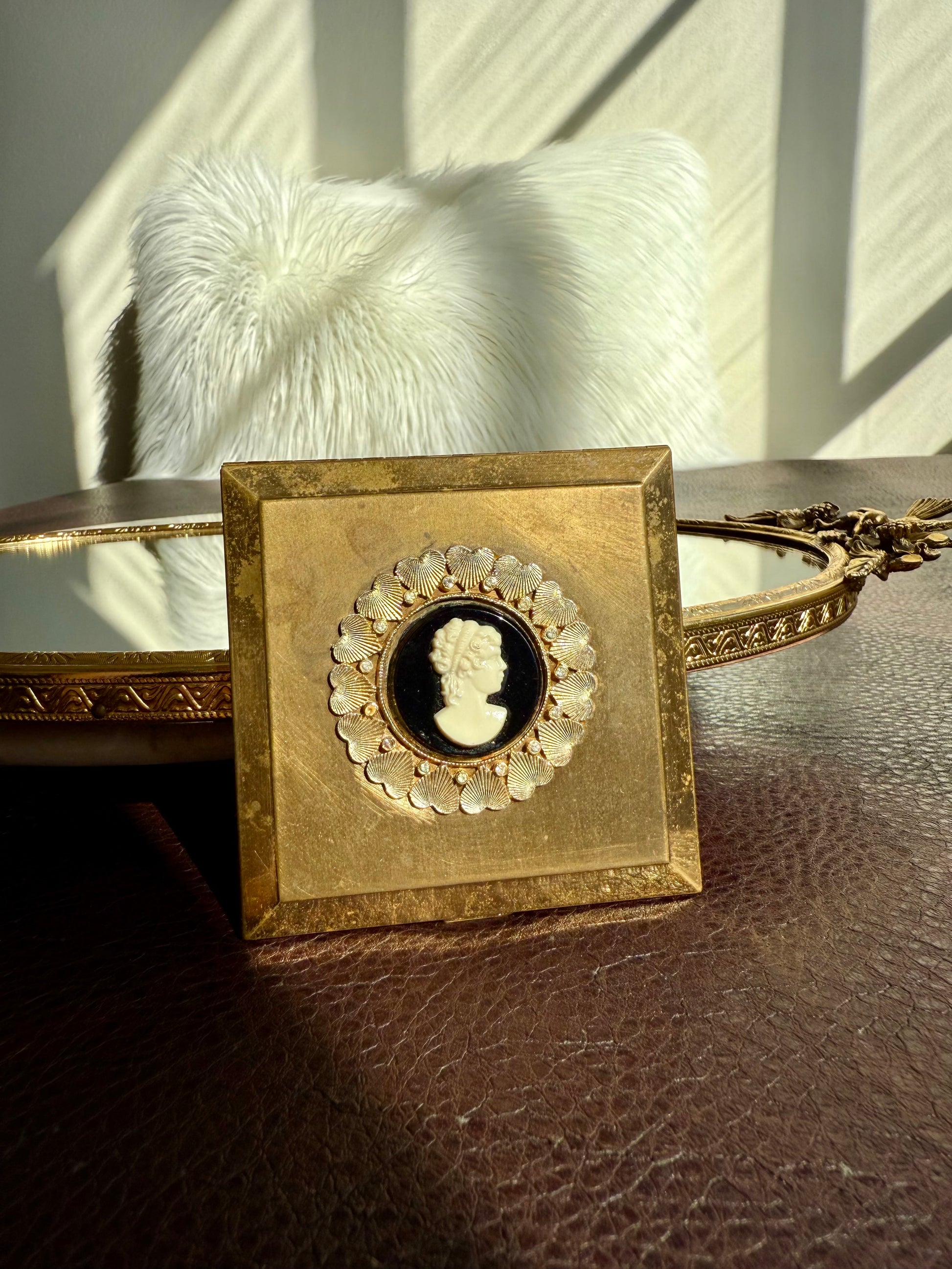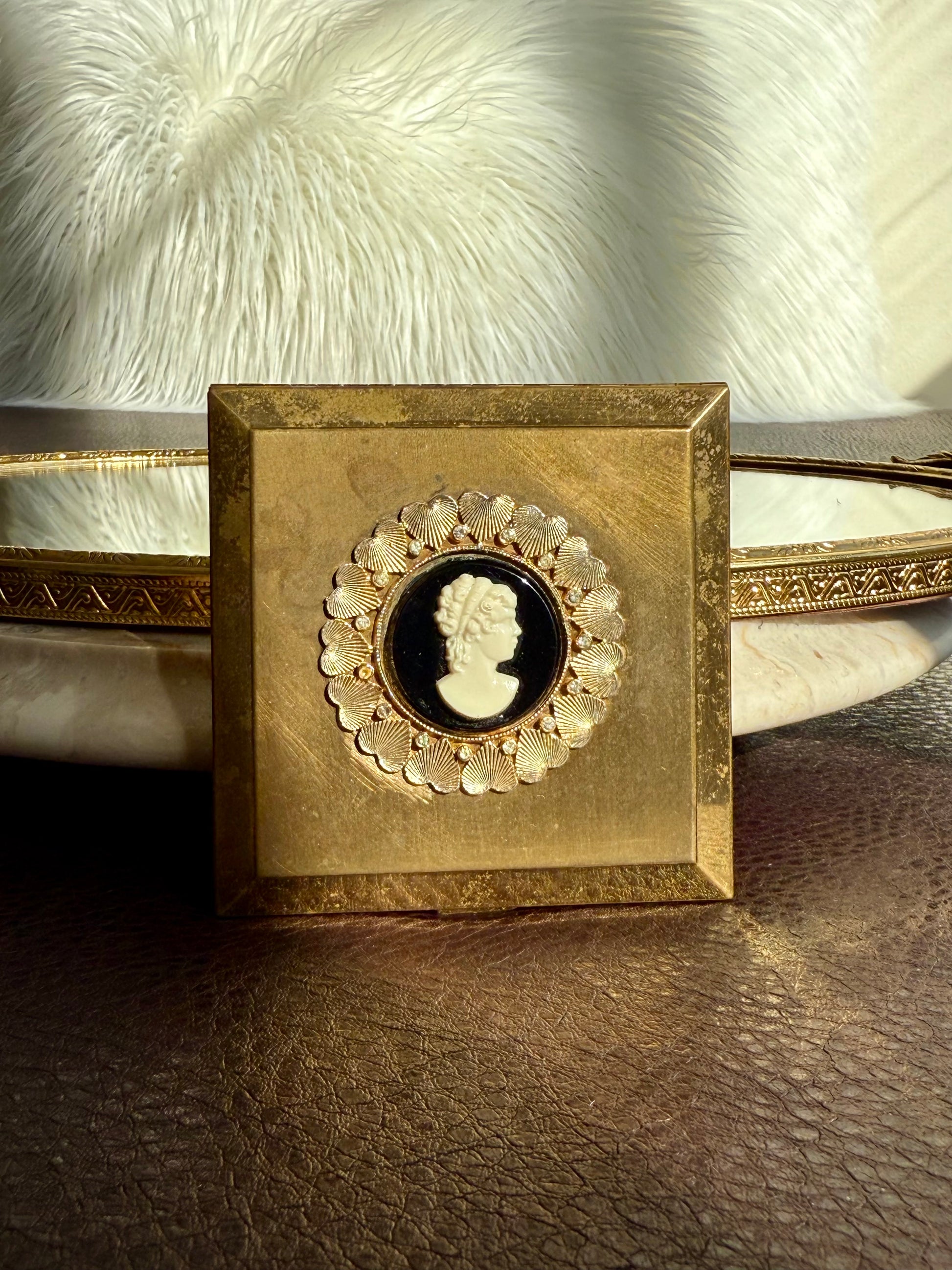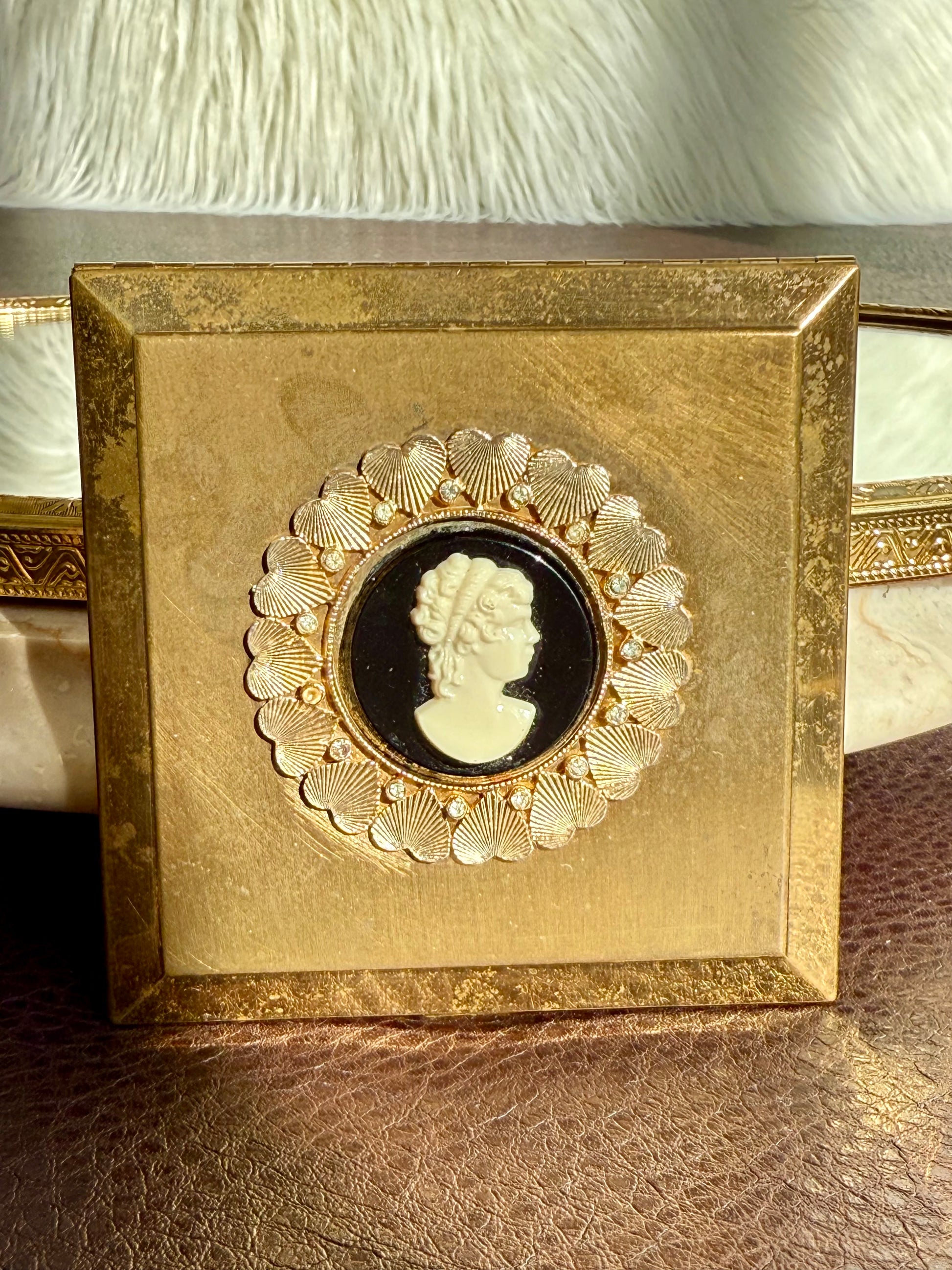 Beautiful rare to find, circa 1940s vintage Voluptè brass powder compact mirror. It’s in very good vintage condition. The Cameo part is surrounded by gold hearts and gemstones, with scalloped edges. Due to its age, there is some discoloration on the metal parts on the outside of the product, as can be seen in the photos. Made in USA.