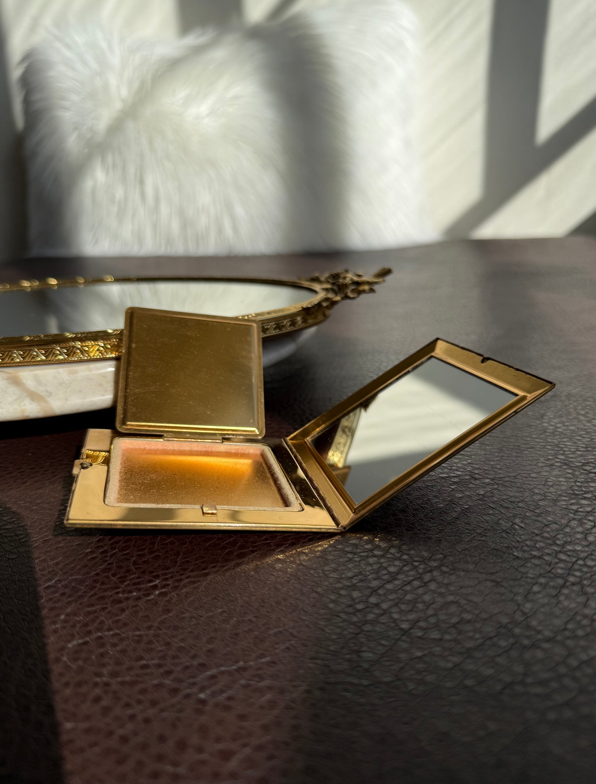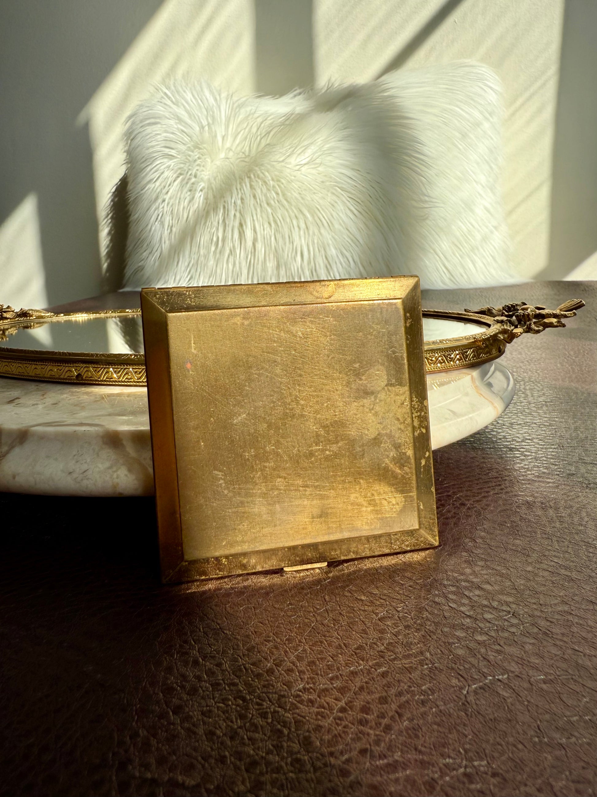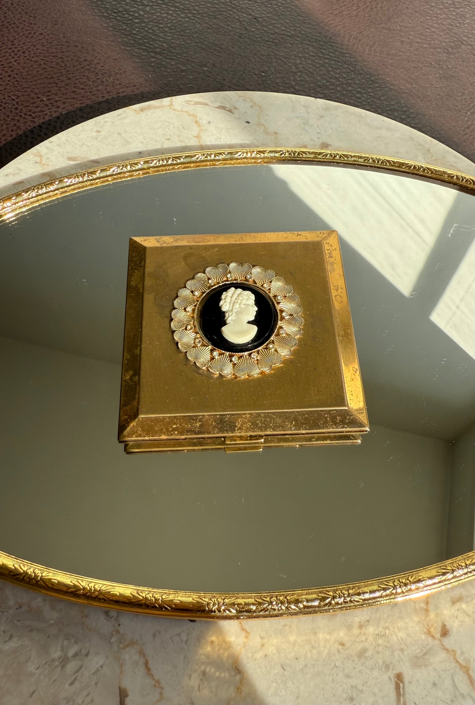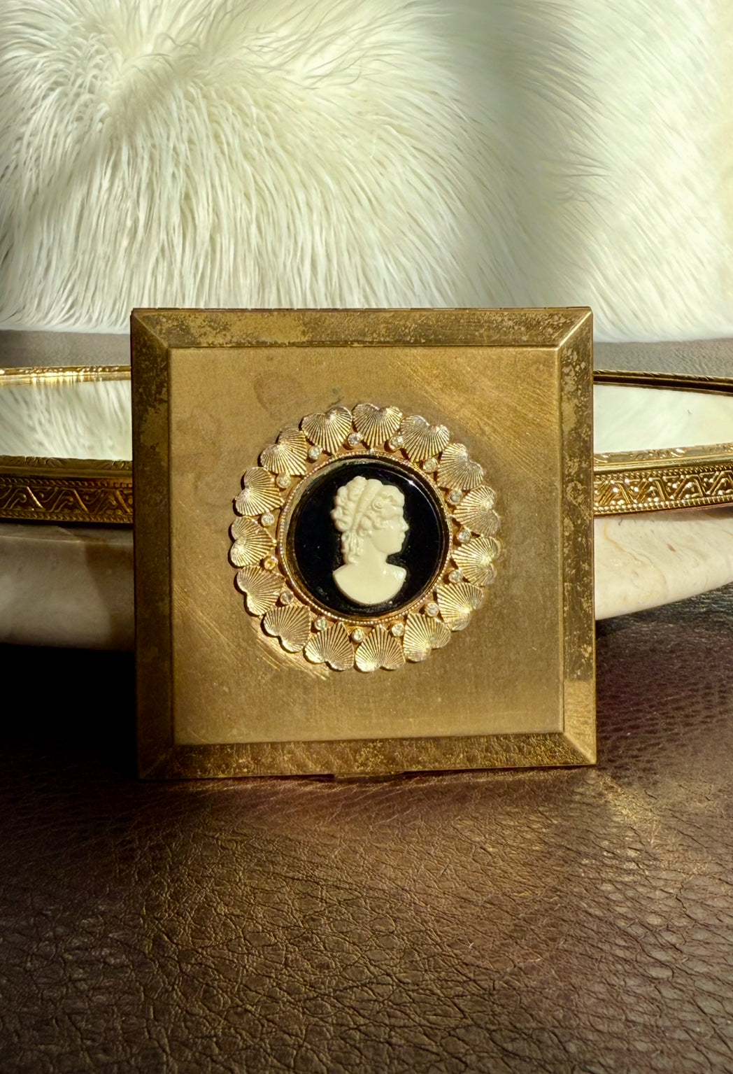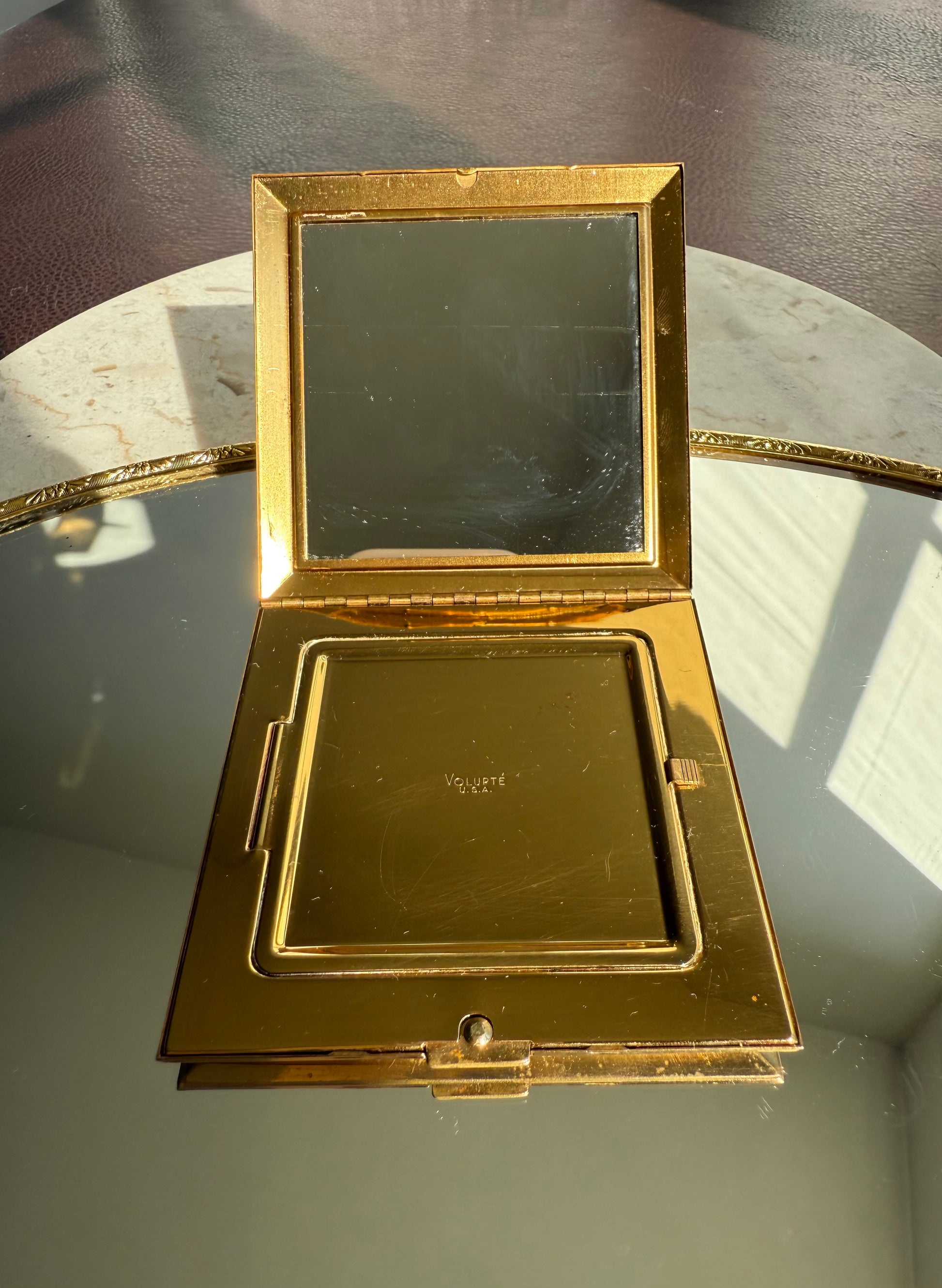 Beautiful rare to find, circa 1940s vintage Voluptè brass powder compact mirror. It’s in very good vintage condition. The Cameo part is surrounded by gold hearts and gemstones, with scalloped edges. Due to its age, there is some discoloration on the metal parts on the outside of the product, as can be seen in the photos. Made in USA.